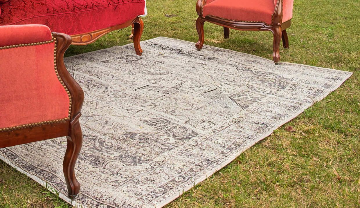 Dywan o klasycznym wzorze w stonowanym kolorze antracytu.