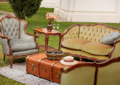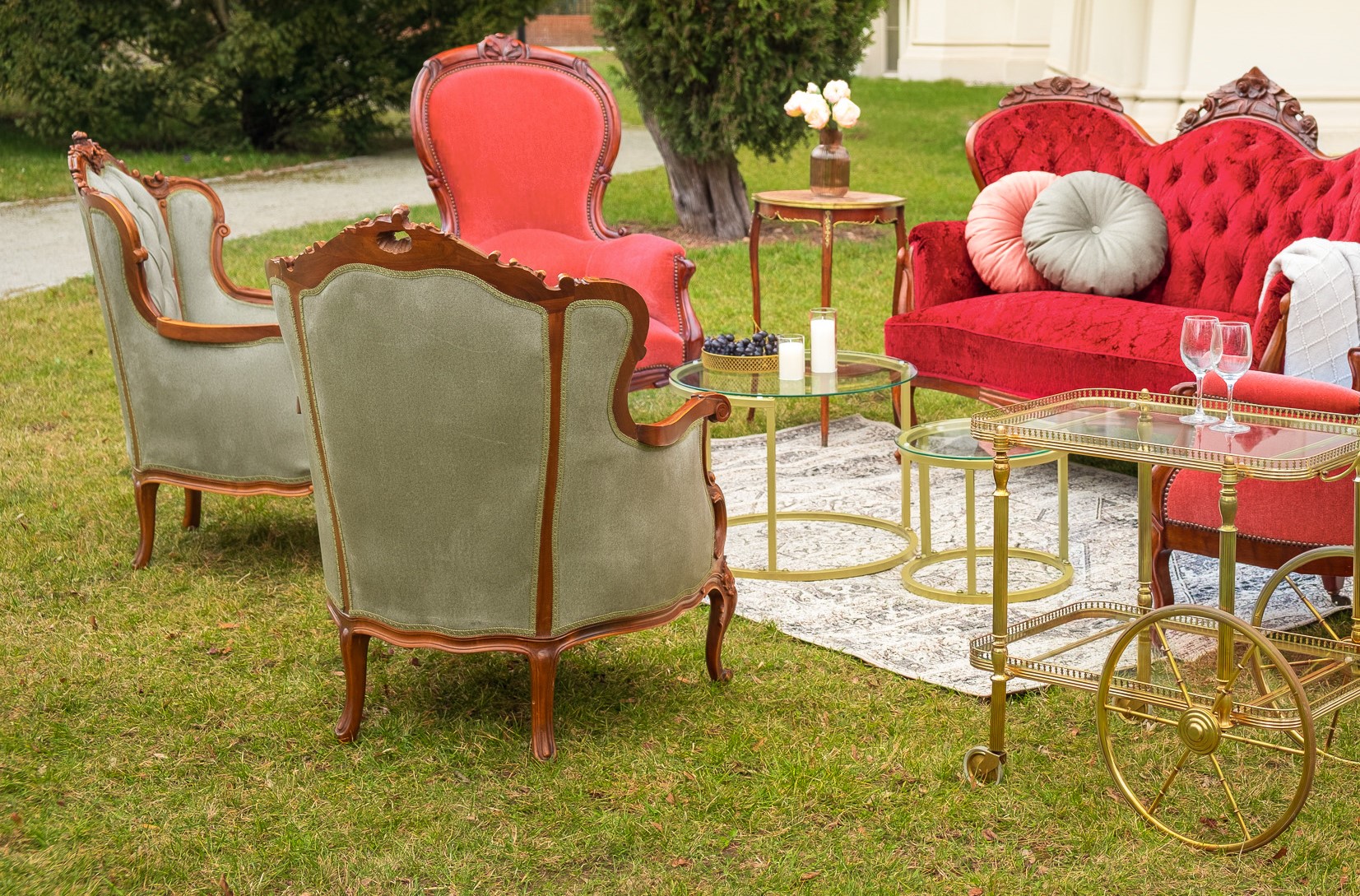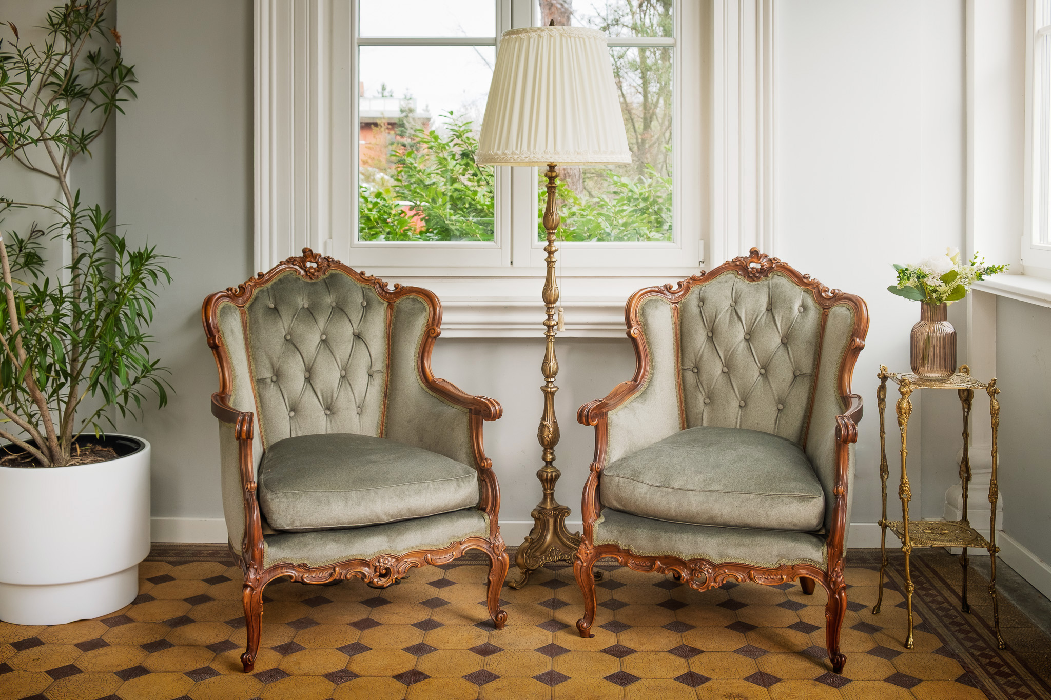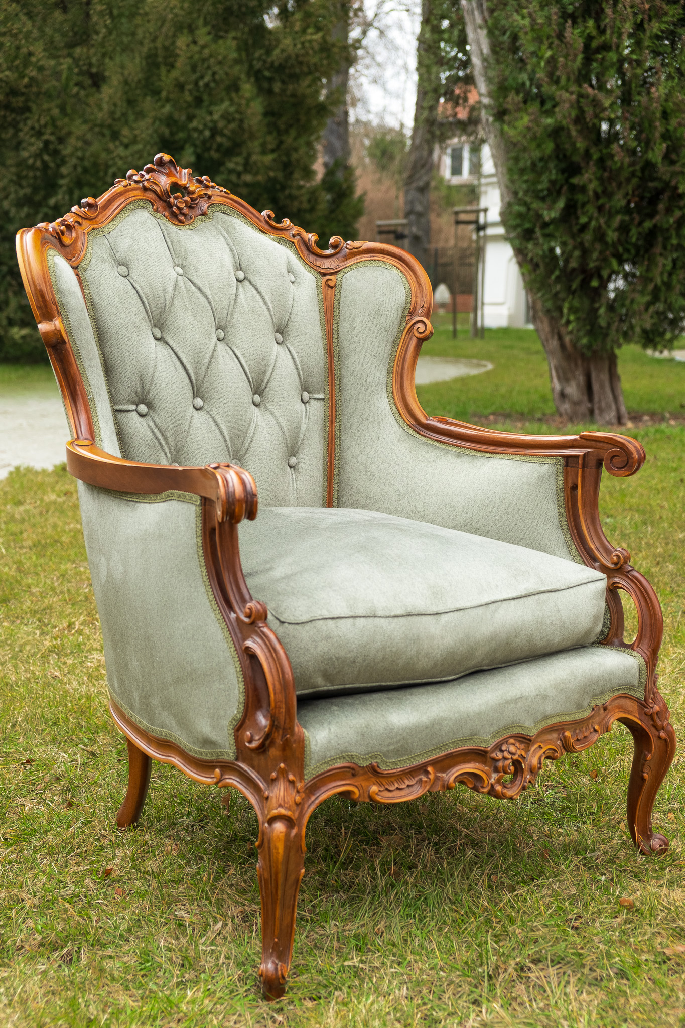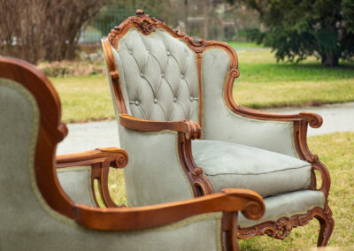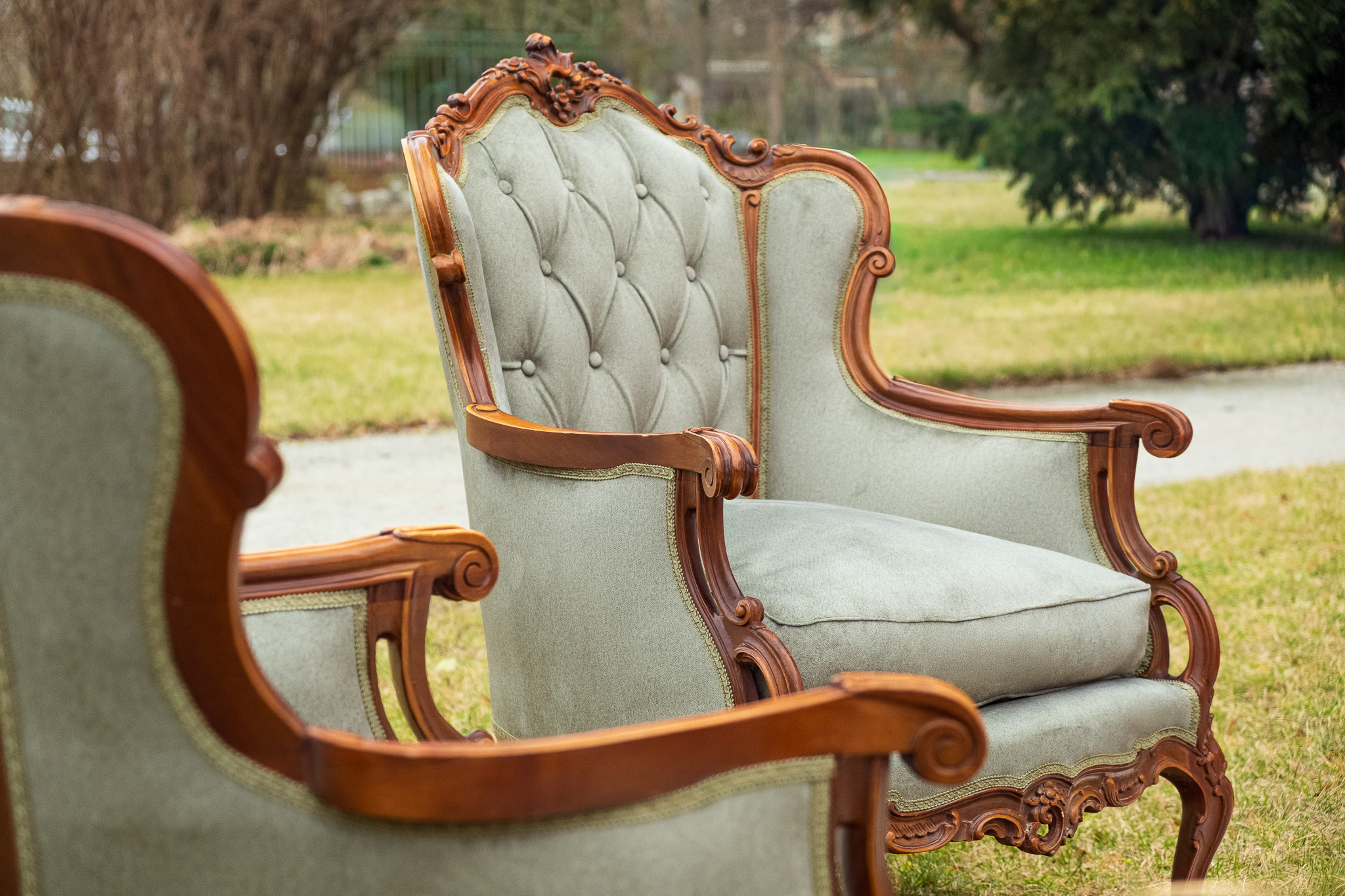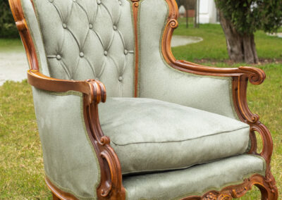 Fotele w stonowanym, szałwiowym odcieniu, z wyjątkowo ozdobną drewnianą ramą z ornamentem muszlowym. Pikowana, welurowa tapicerka zapewnia wyjątkową miękkość i stylowy wygląd.