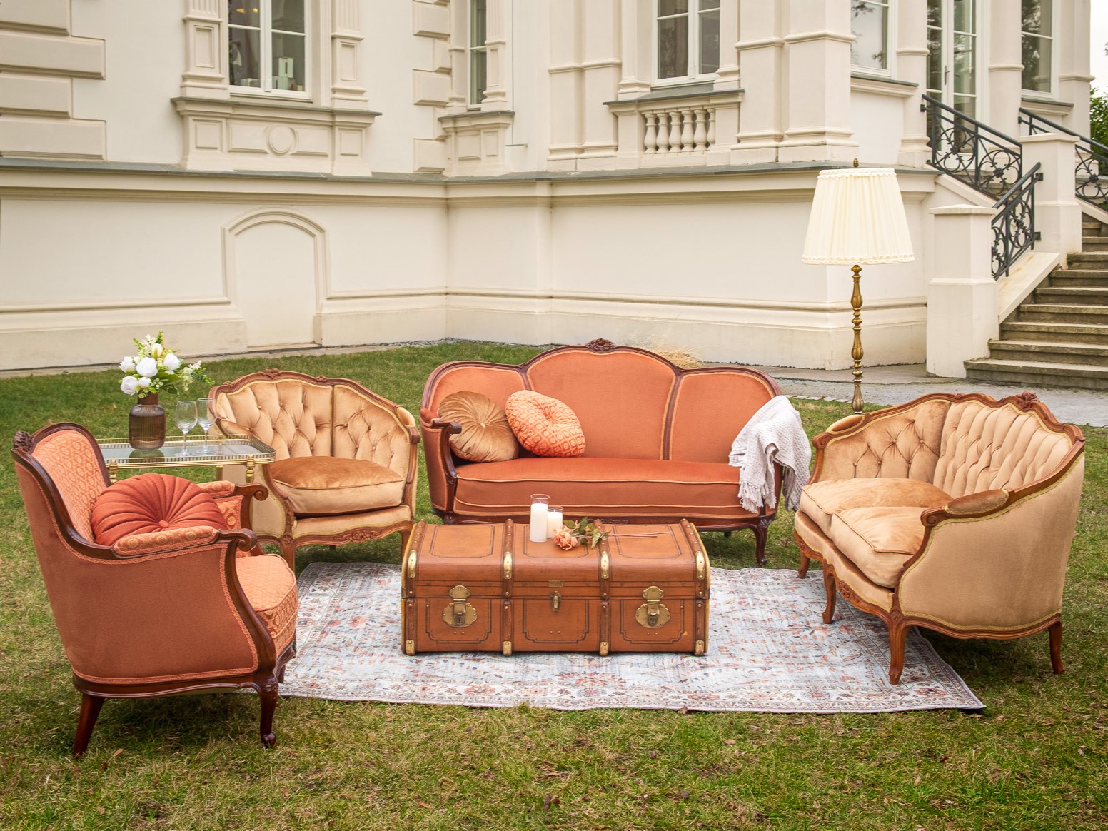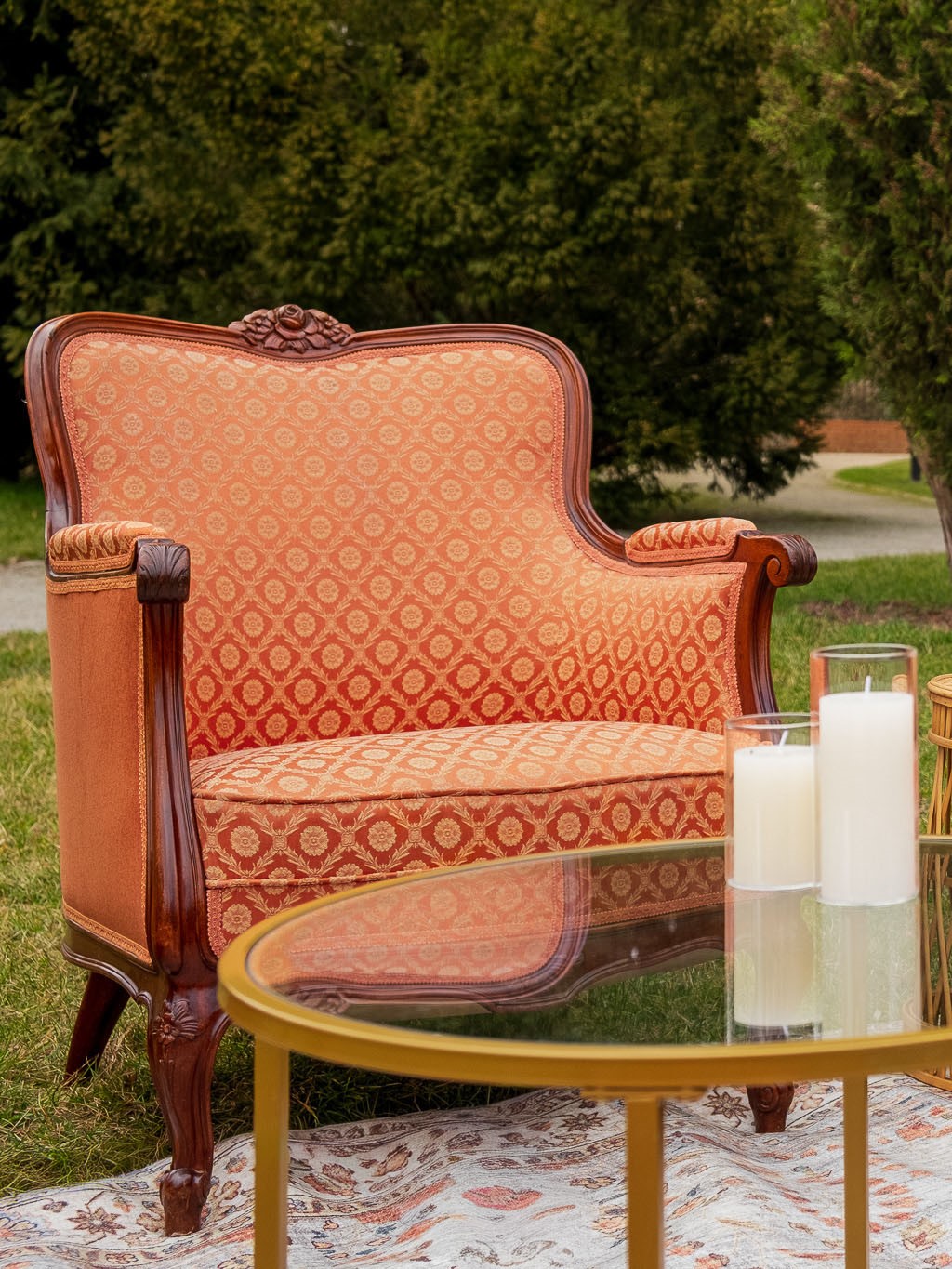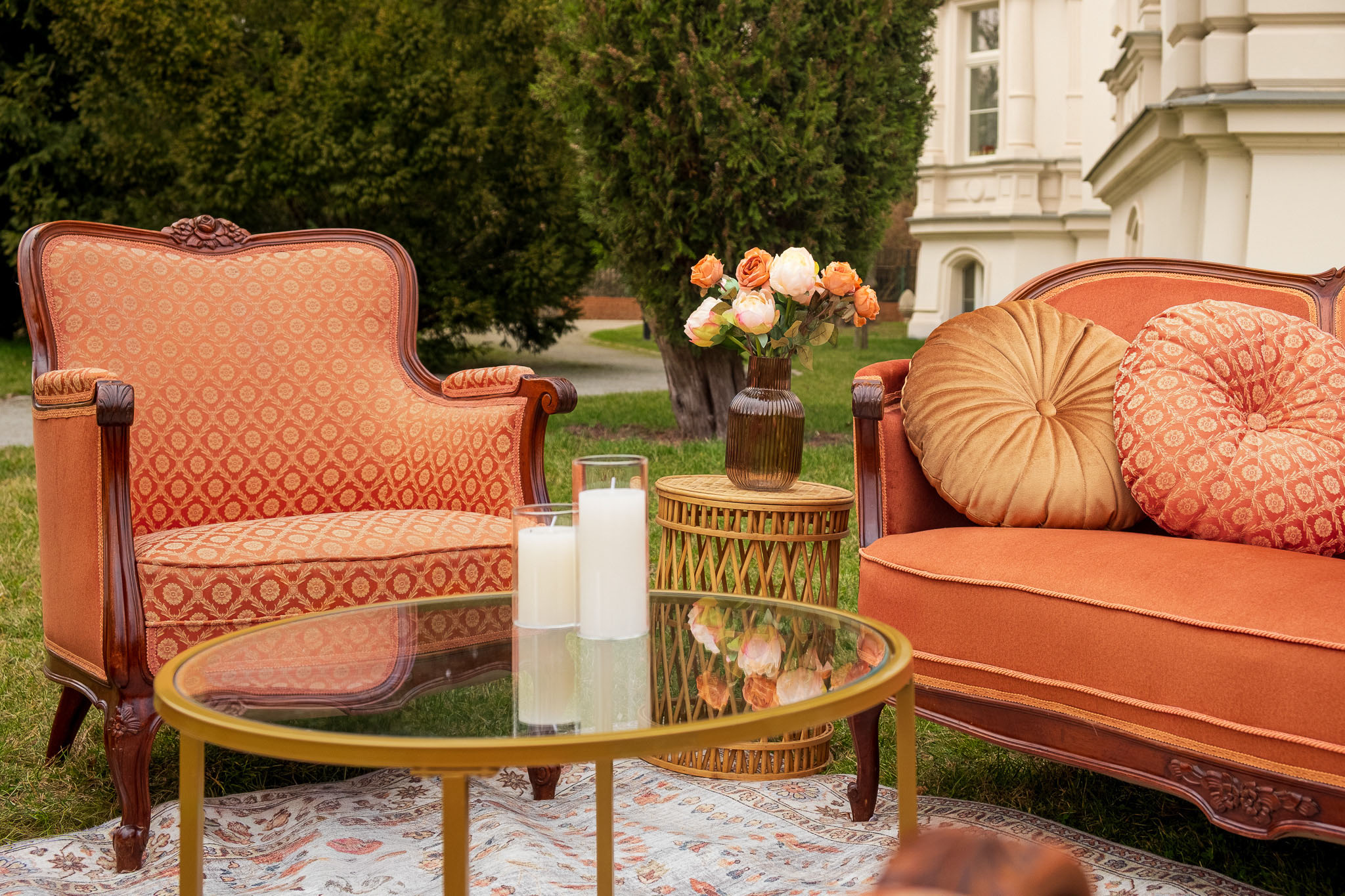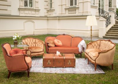 Fotele w ciepłym odcieniu terakoty z motywem róży rzeźbionym na ramie, wewnętrzna strona foteli we wzorach.