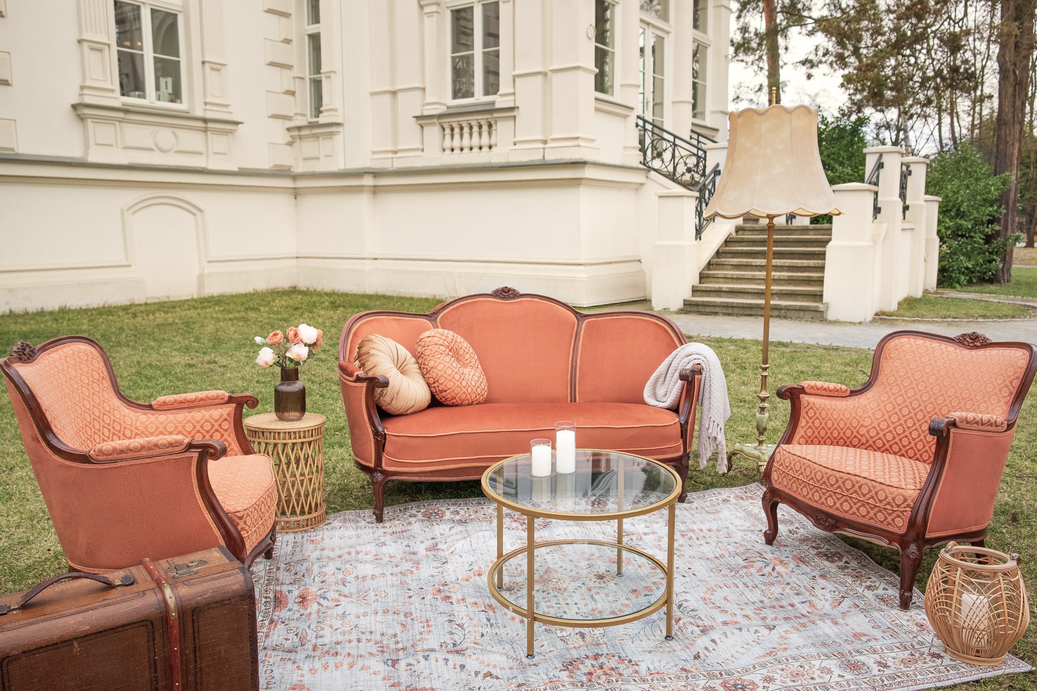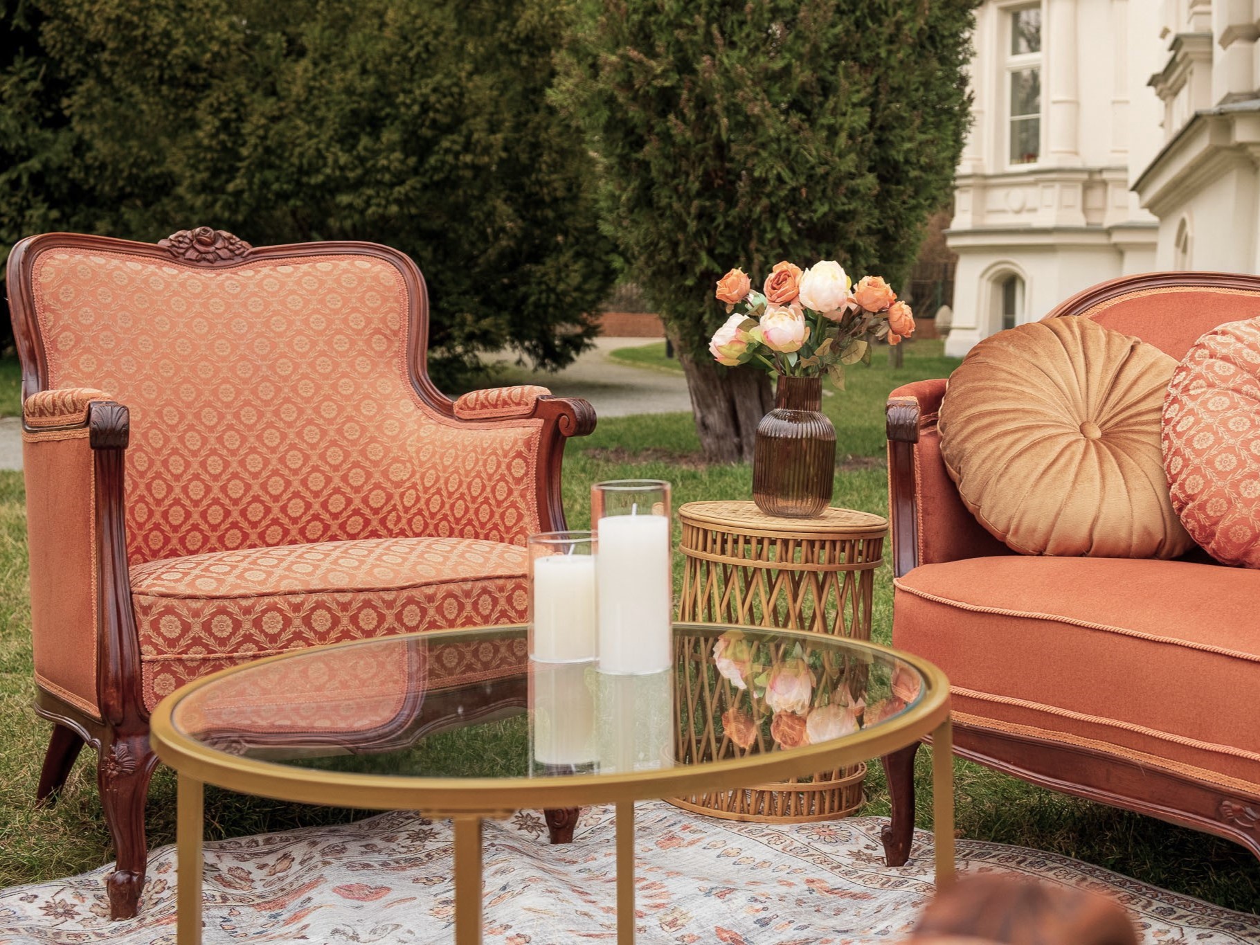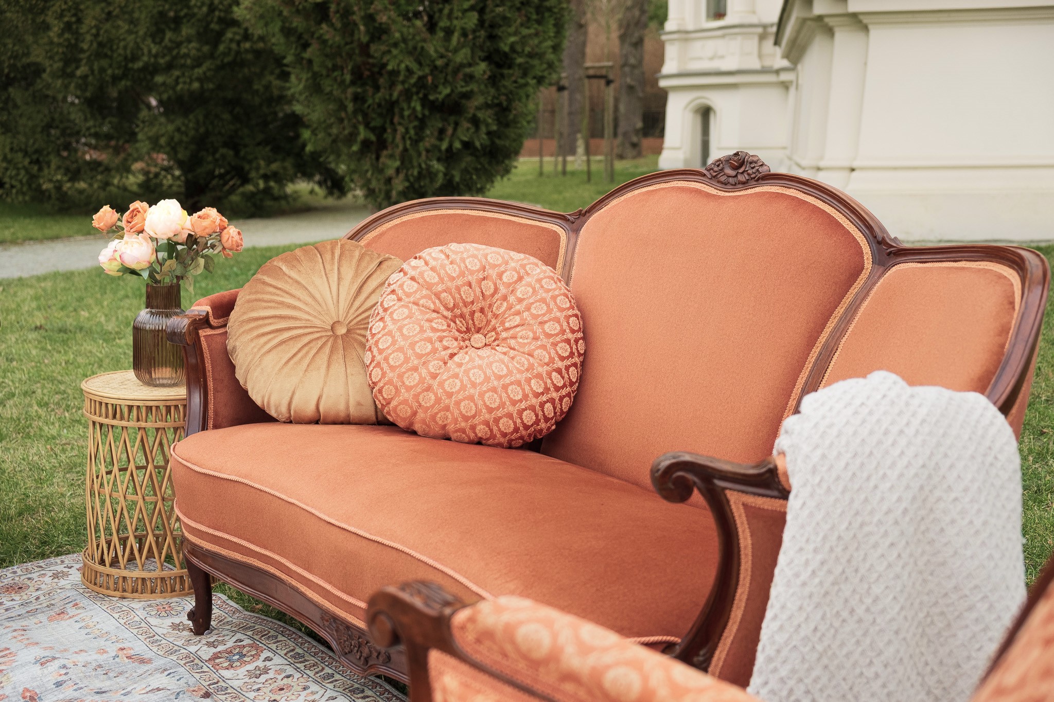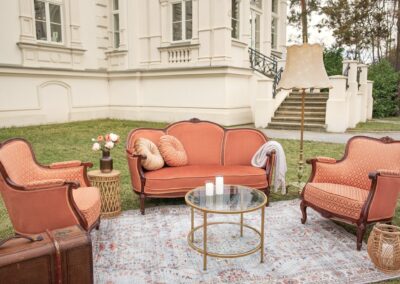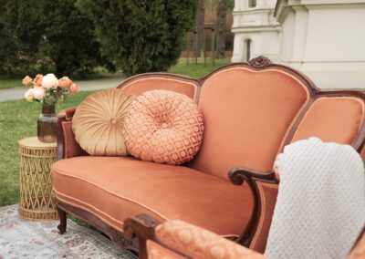 Sofa w charakterystycznym kształcie przypominającym muszlę oraz fotele zachwycają tapicerką w ciepłym odcieniu terakoty, przy czym fotele wyróżniają się dodatkowo klasycznym wzorem. Dzięki swojej nietuzinkowej barwie i formie, ten komplet doskonale wpisuje się w artystyczny klimat boho, tworząc przytulną strefę do relaksu.
