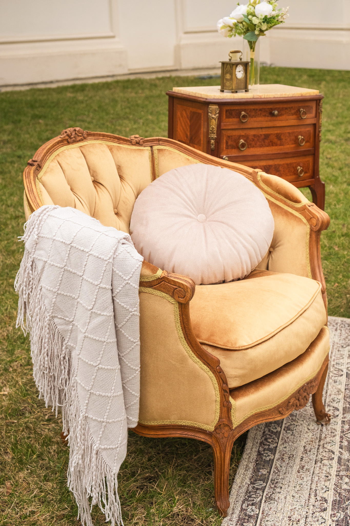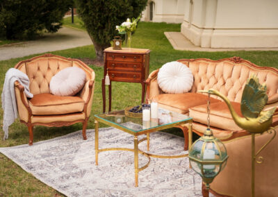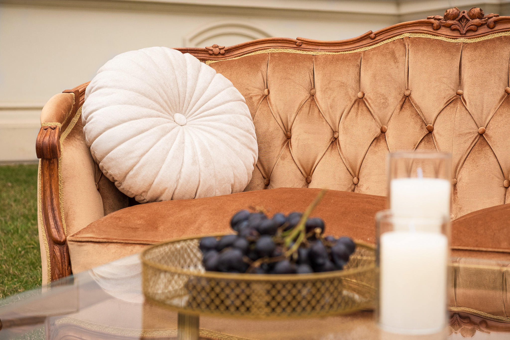 Zestaw, który wyróżnia się ciepłym, miodowo-złotym odcieniem weluru. Głębokie pikowanie sofy i foteli tworzy efektowną formę, idealną do relaksu. Jasną, drewnianą ramę wieńczą rzeźbione róże. Ten komplet zachwyca przepięknym, jedwabistym połyskiem materiału.
