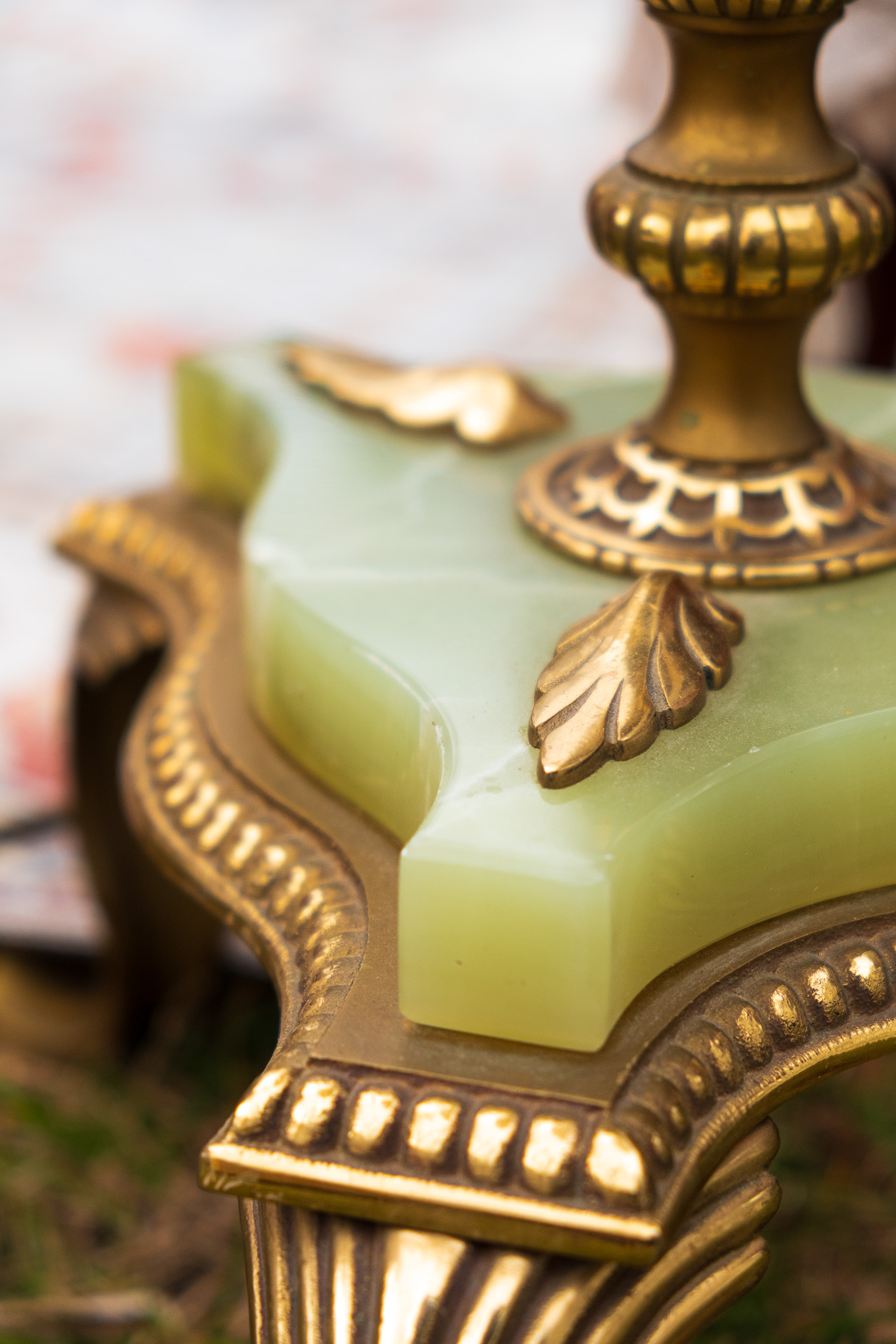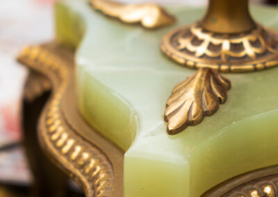 Elegancka lampa stojąca z ozdobną mosiężną nóżką z onyksem i kloszem w kolorze beżowym.