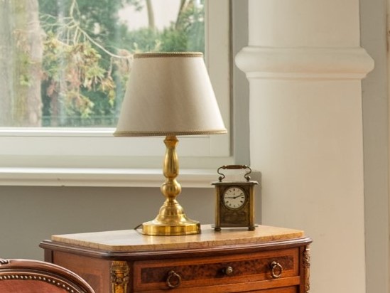 Lampa stołowa z mosiężną nóżką i beżowym abażurem wykończonym ozdobną lamówką.