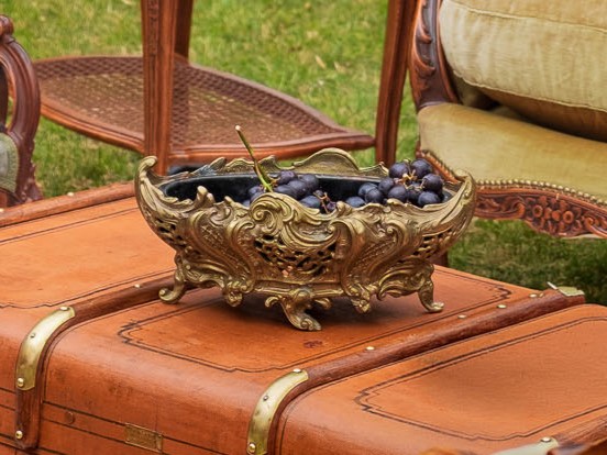 Bogato zdobiona, mosiężna patera-żardiniera. Doskonale sprawdzi się jako elegancka misa na owoce lub stylowy pojemnik na kwiatowe kompozycje.