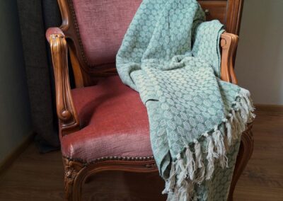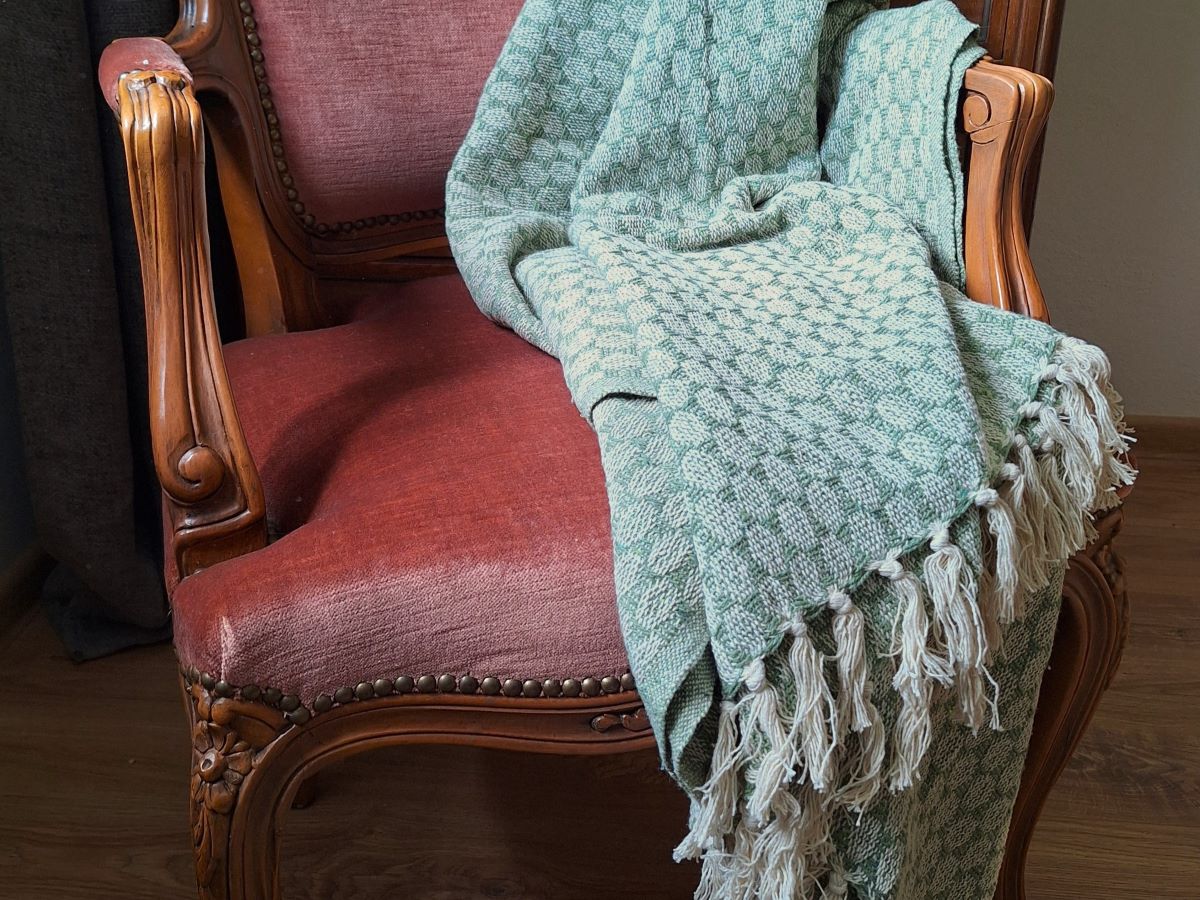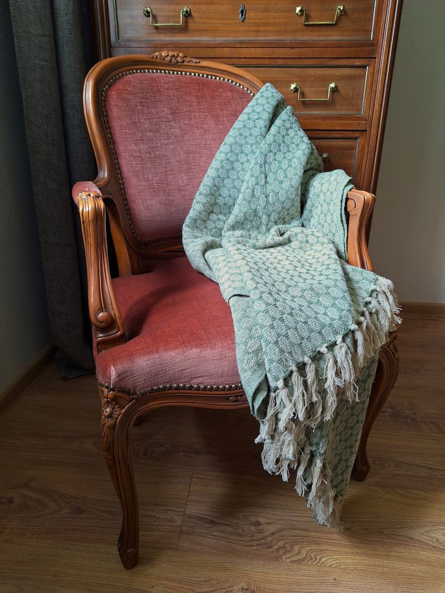 Koc we wzory w kolorze zielono-białym z frędzlami.