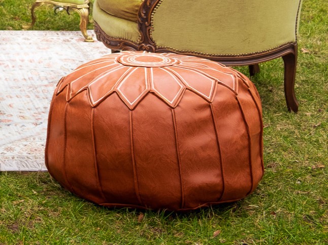 Okrągła, brązowa pufa w stylu marokańskim, ozdobiona przeszyciami.
