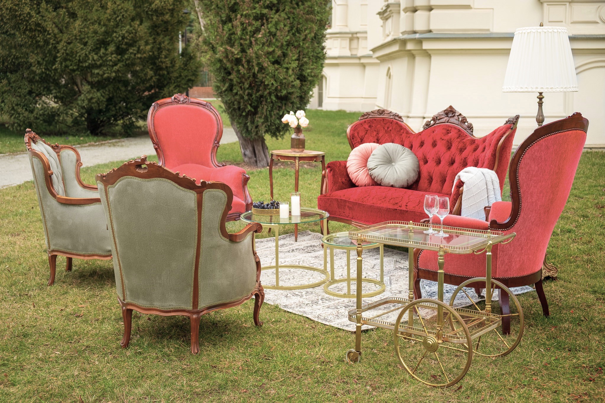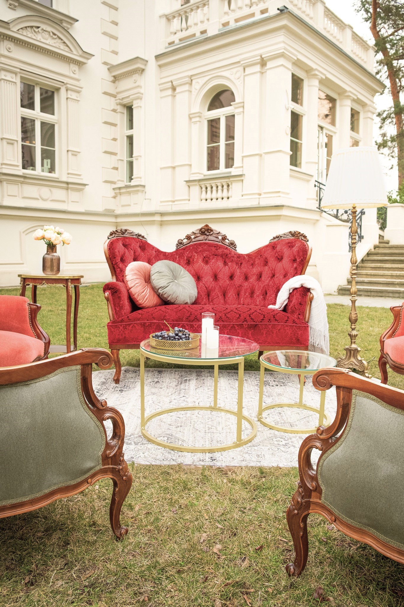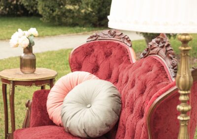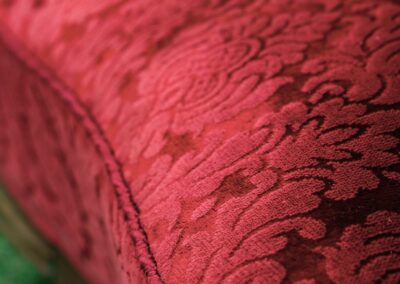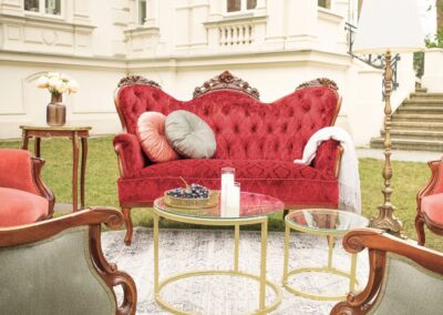 Ten komplet mebli to nie tylko element wyposażenia, to centralny punkt, który przyciąga wzrok i natychmiastowo nadaje przestrzeni dworską atmosferę, wprowadzając do niej grację królewskich komnat. Sofę zdobi szlachetny, zamszowy aksamit w nasyconym, głębokim odcieniu burgundu, podczas gdy fotele zachwycają wyrazistym karmazynem. Wyjątkowy charakter sofy podkreślają głębokie pikowania, a drewnianą ramę dodatkowo wieńczą misternie rzeźbione róże.