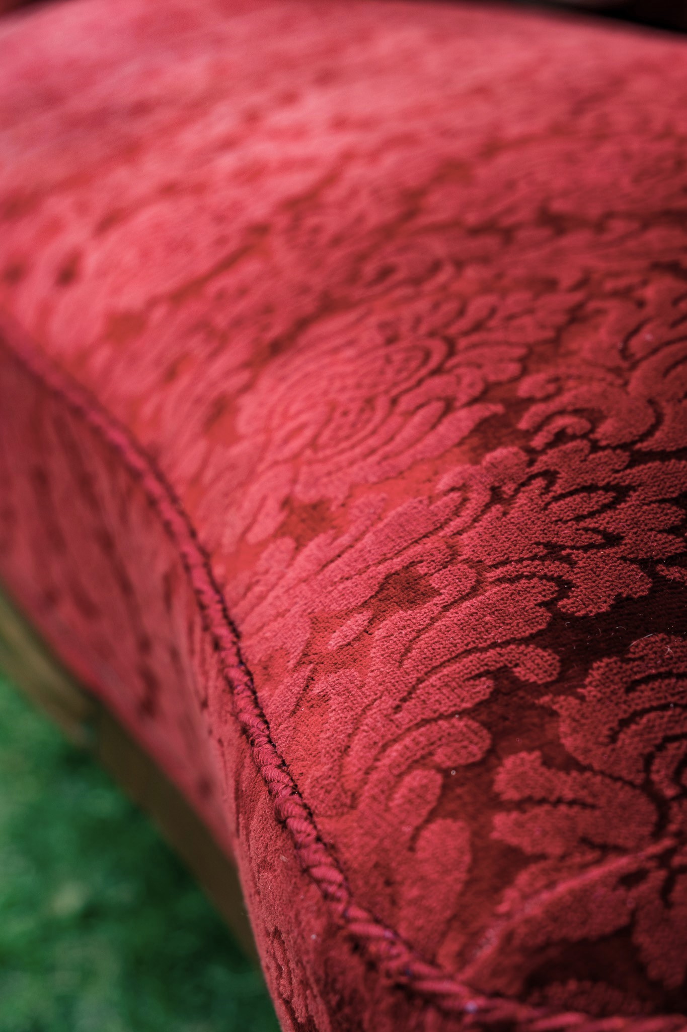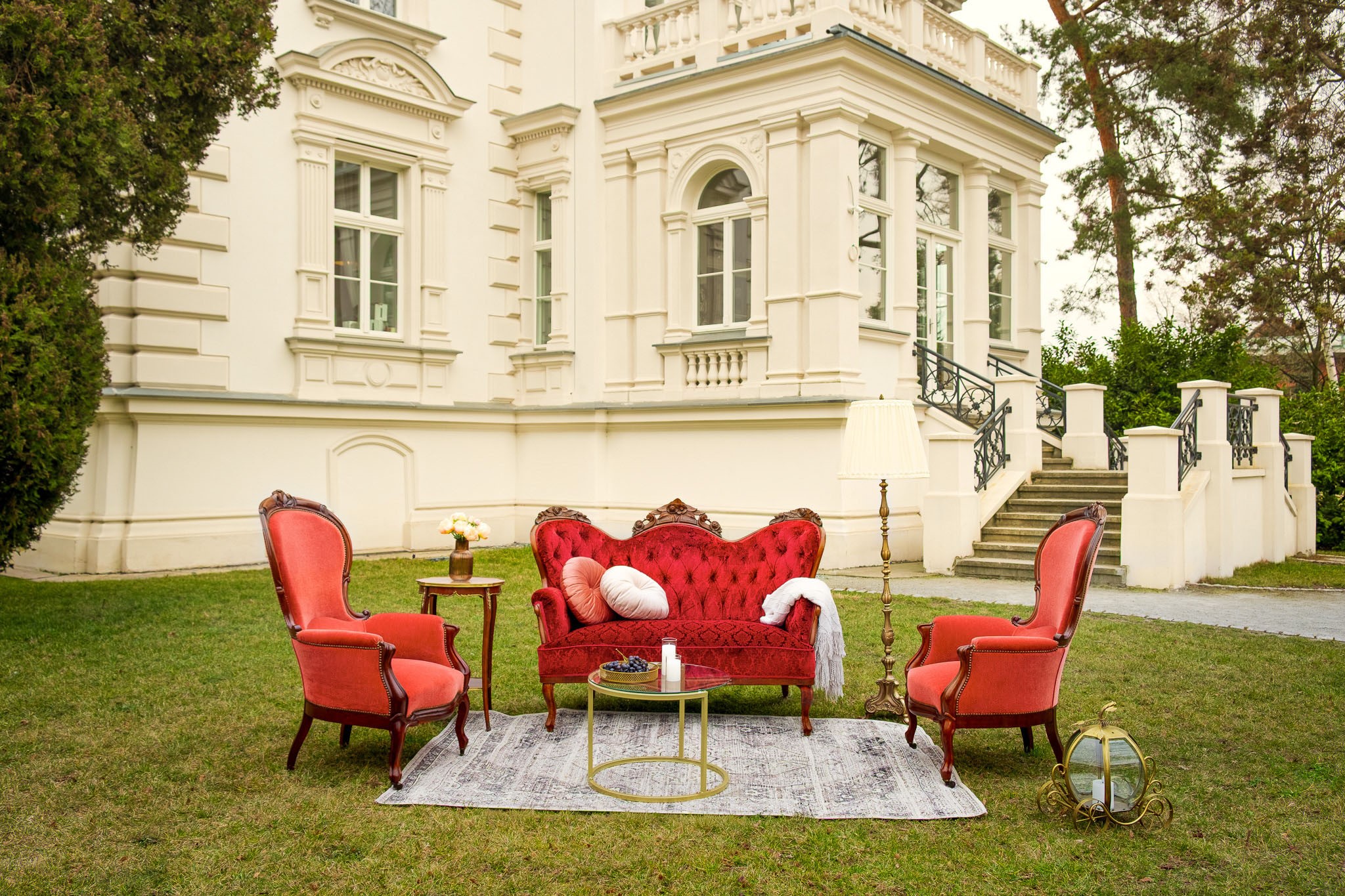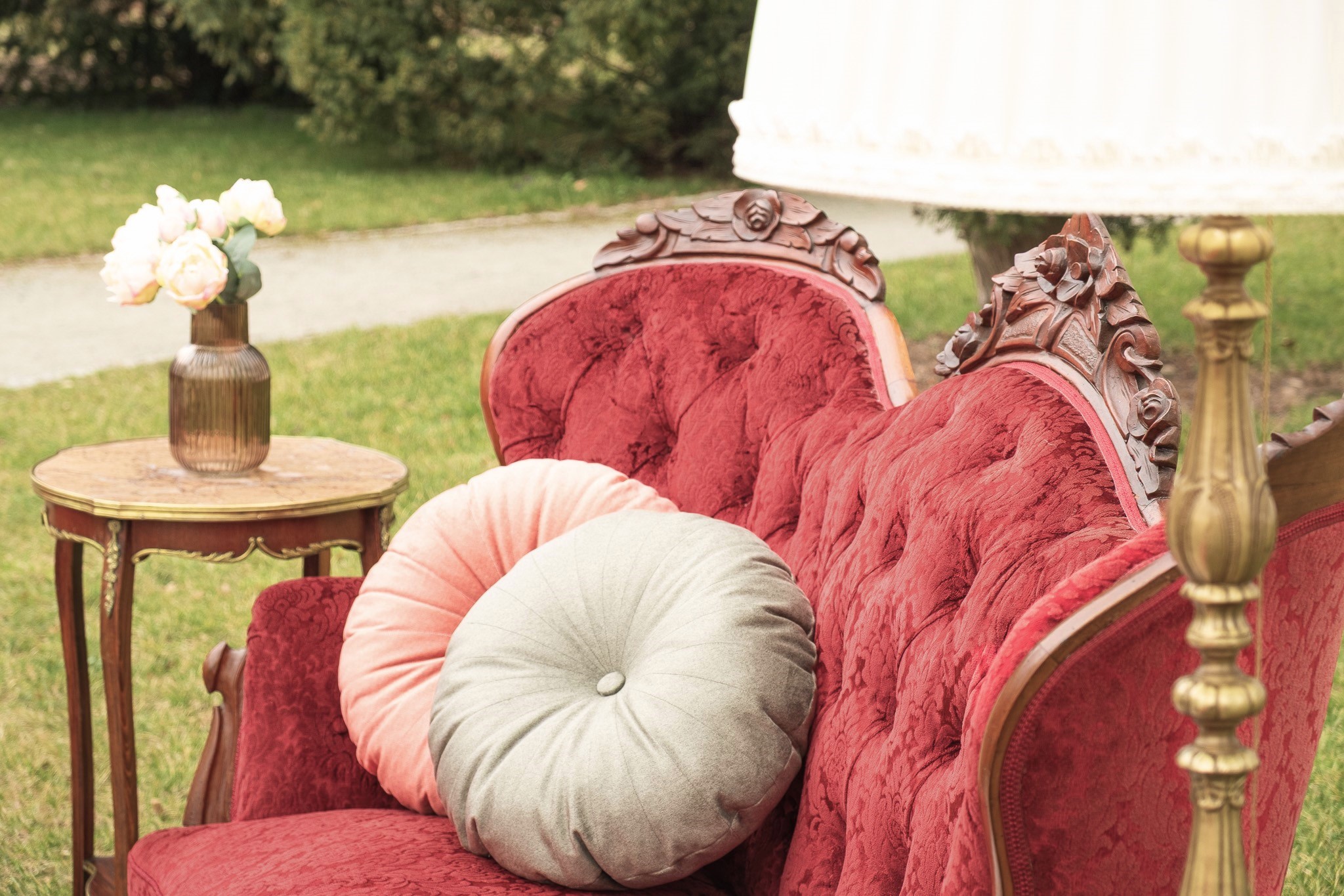 Ten komplet mebli to nie tylko element wyposażenia, to centralny punkt, który przyciąga wzrok i natychmiastowo nadaje przestrzeni dworską atmosferę, wprowadzając do niej grację królewskich komnat. Sofę zdobi szlachetny, zamszowy aksamit w nasyconym, głębokim odcieniu burgundu, podczas gdy fotele zachwycają wyrazistym karmazynem. Wyjątkowy charakter sofy podkreślają głębokie pikowania, a drewnianą ramę dodatkowo wieńczą misternie rzeźbione róże.