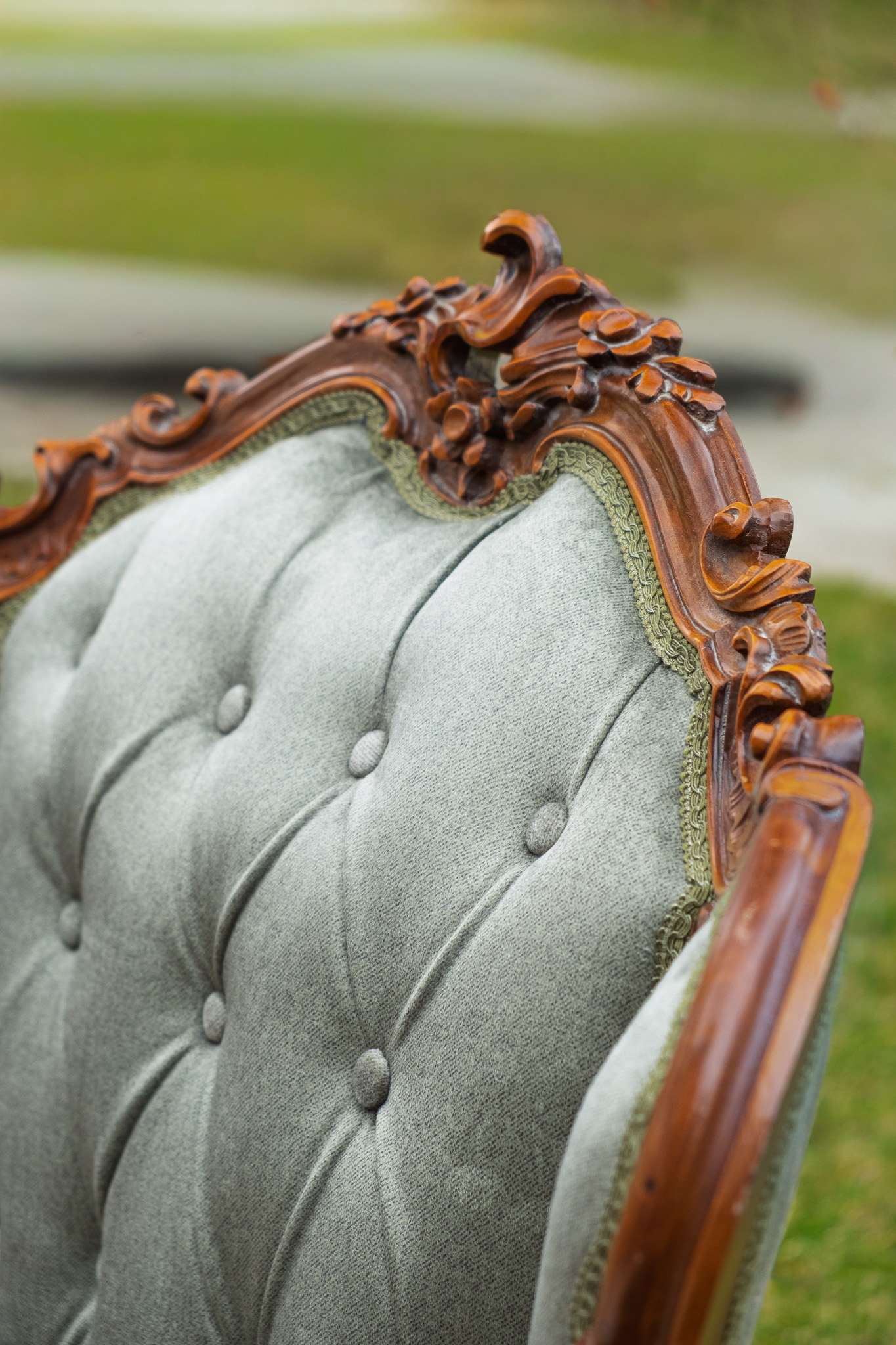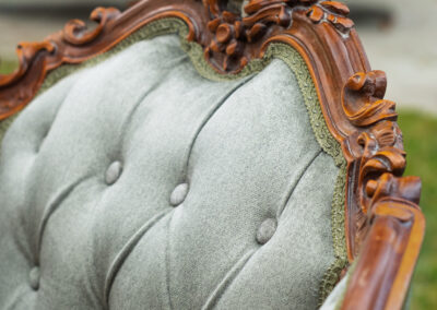 Uzupełnieniem są fotele w stonowanym, szałwiowym odcieniu, z wyjątkowo ozdobną drewnianą ramą z ornamentem muszlowym. Pikowana, welurowa tapicerka zapewnia wyjątkową miękkość i stylowy wygląd.