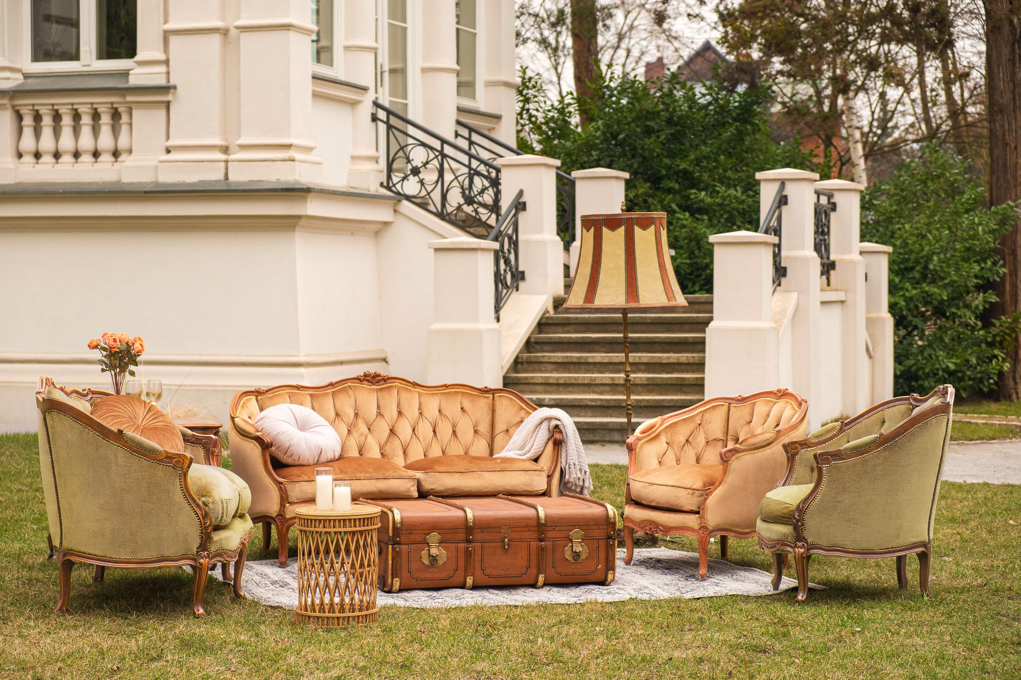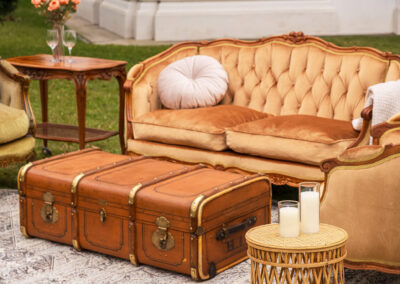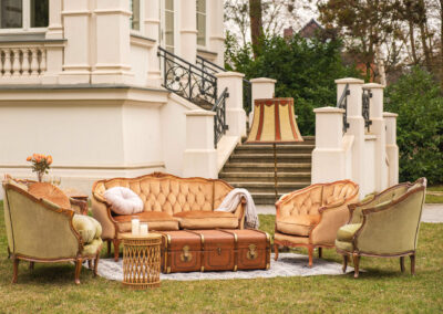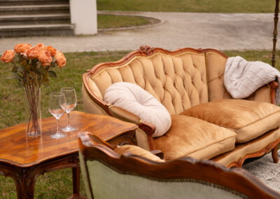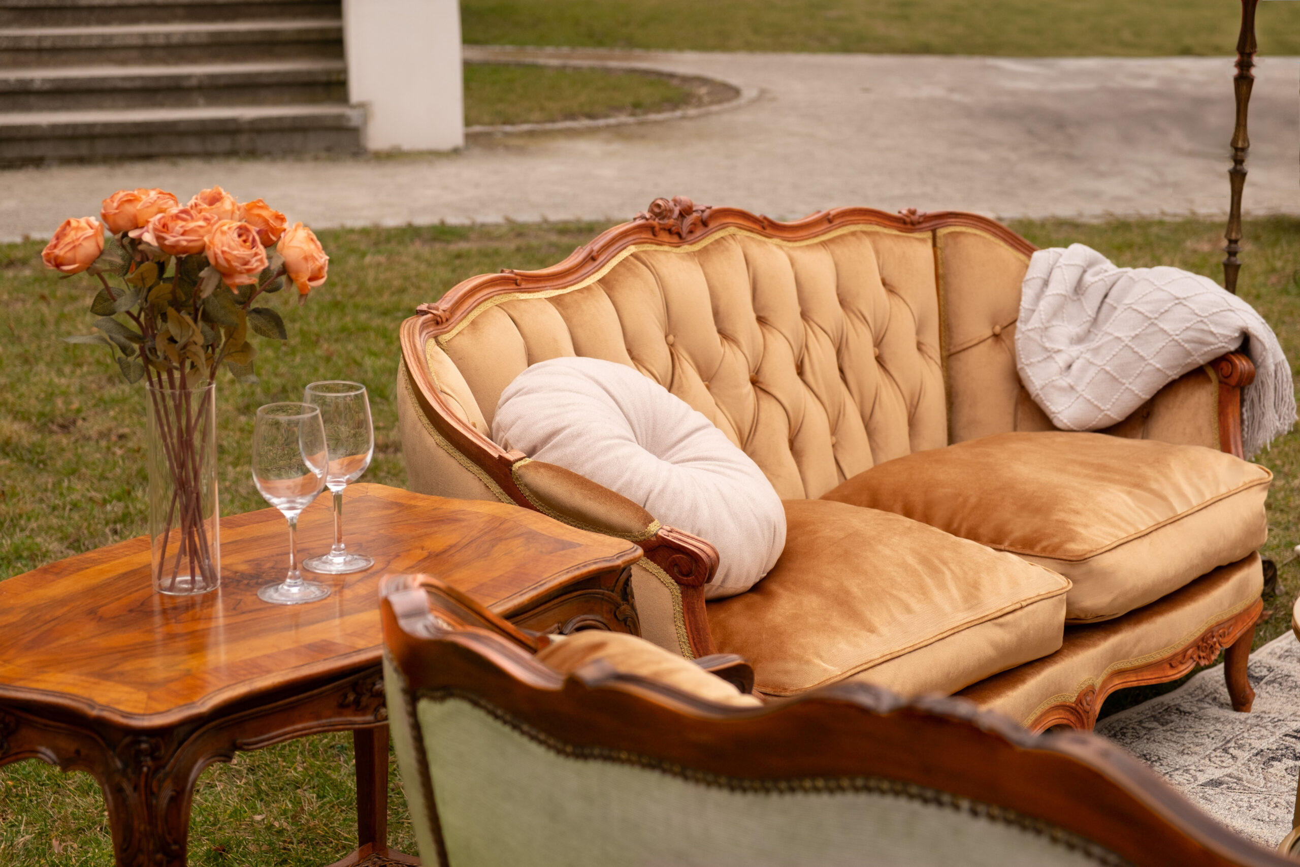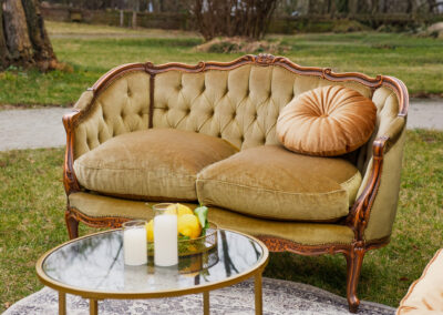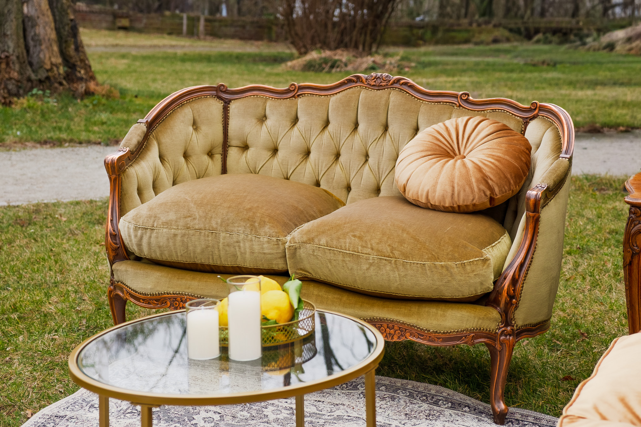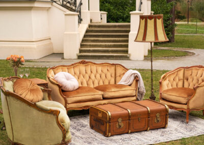 Zjawiskowy zestaw, który przyciąga spojrzenia głębokim pikowaniem i aksamitnym wykończeniem w intrygującym odcieniu oliwki oraz miodowego złota. Drewniane ramy wieńczą rzeźbione róże.