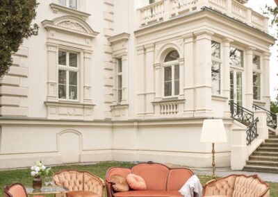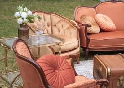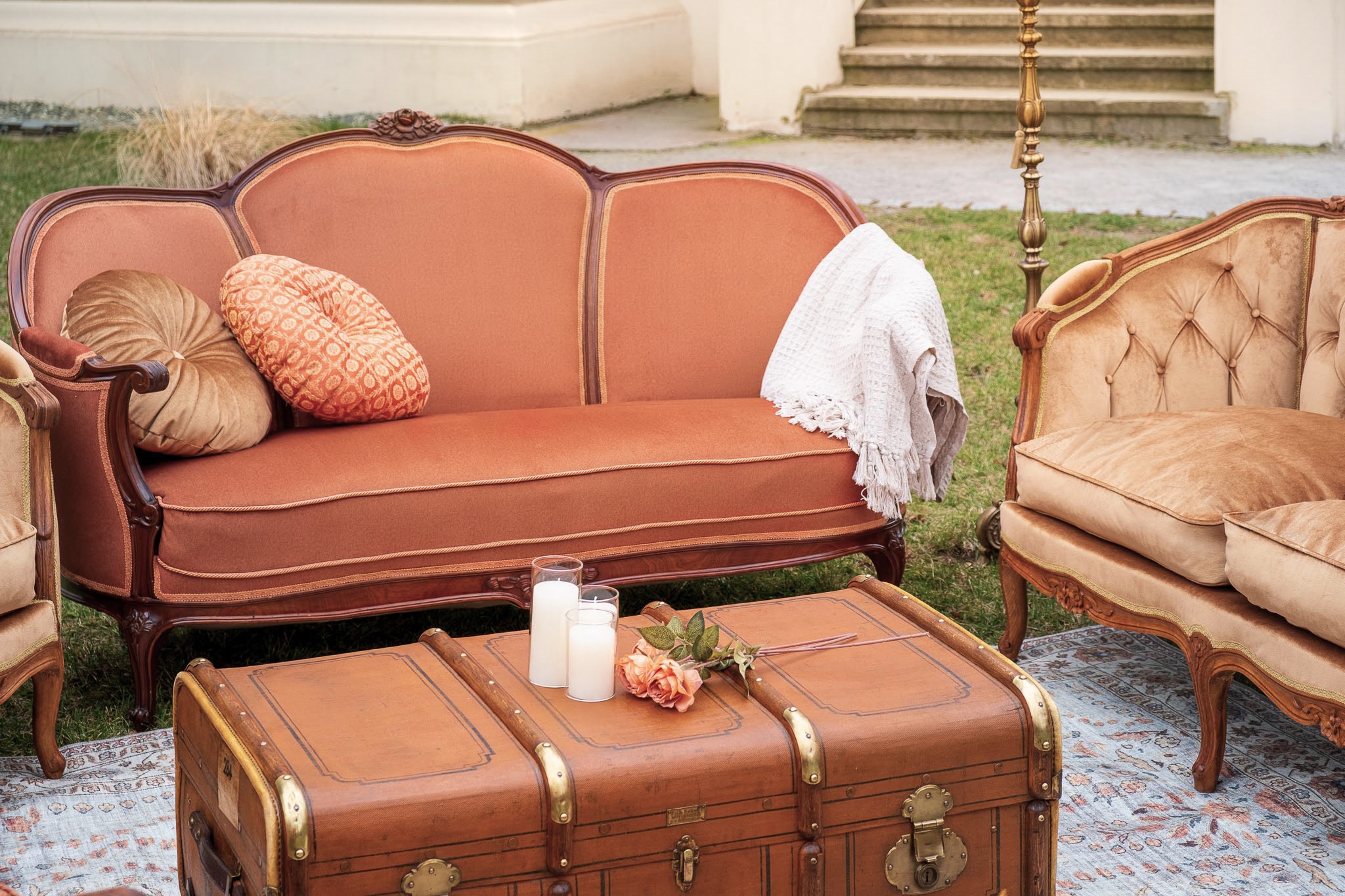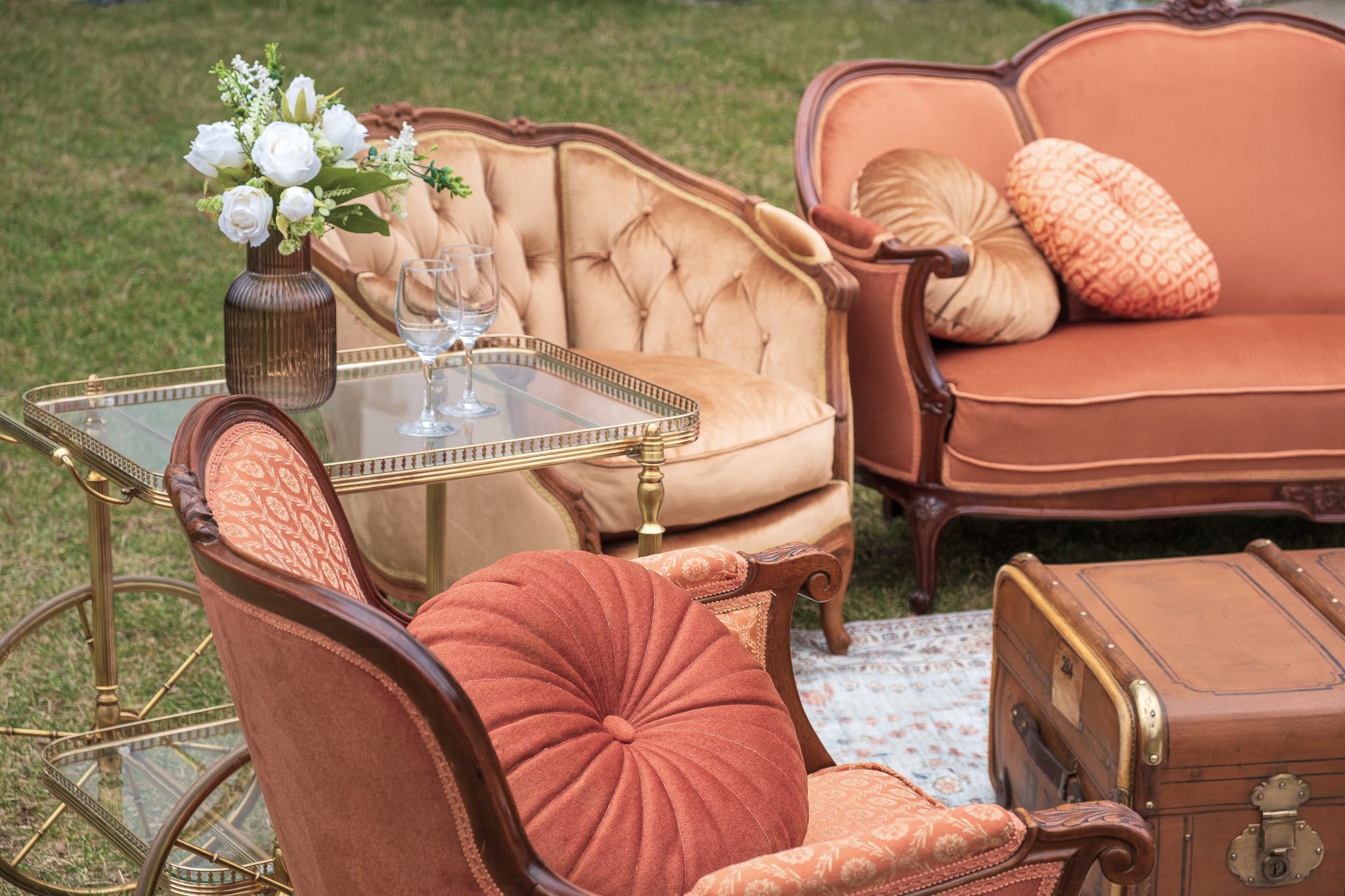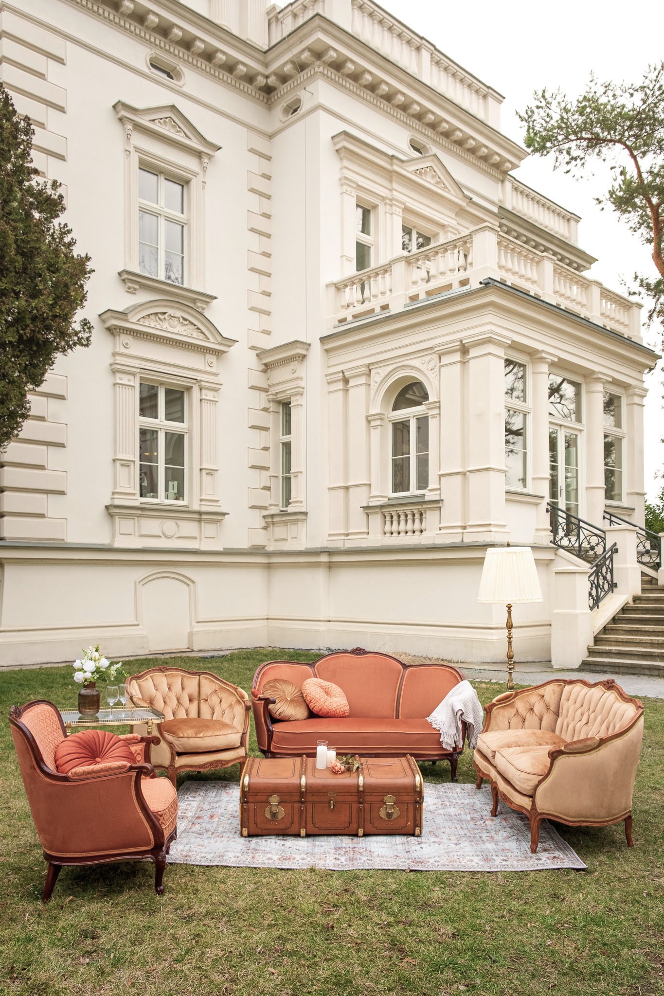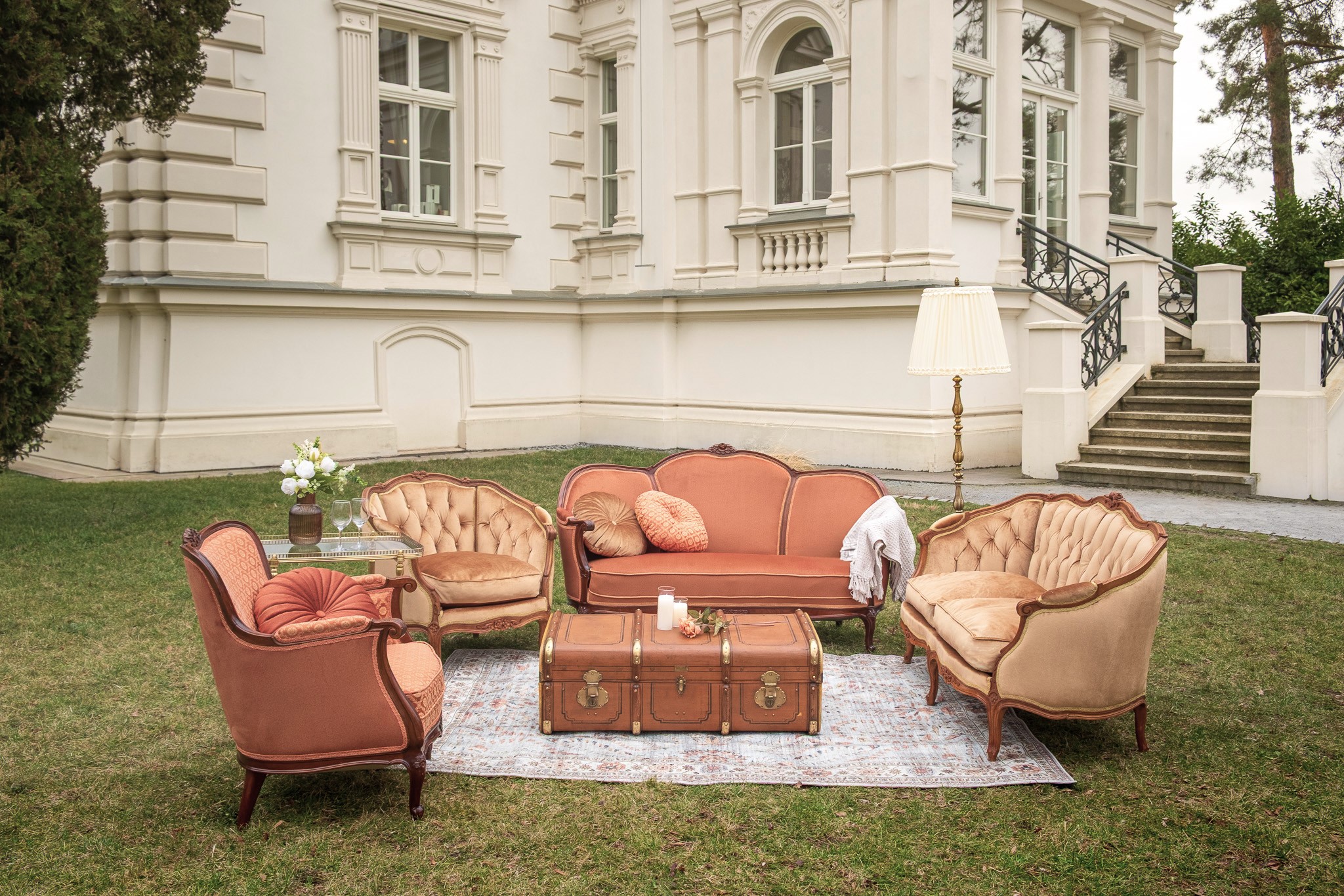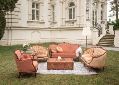 Elegancki zestaw łączący aksamitne pikowania w odcieniu miodowego złota z klasyczną terakotą, tworzący wyjątkowo ciepłą, artystyczną strefę relaksu. Ramy mebli zdobią ręcznie rzeźbione róże.