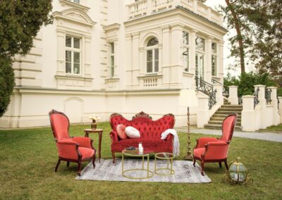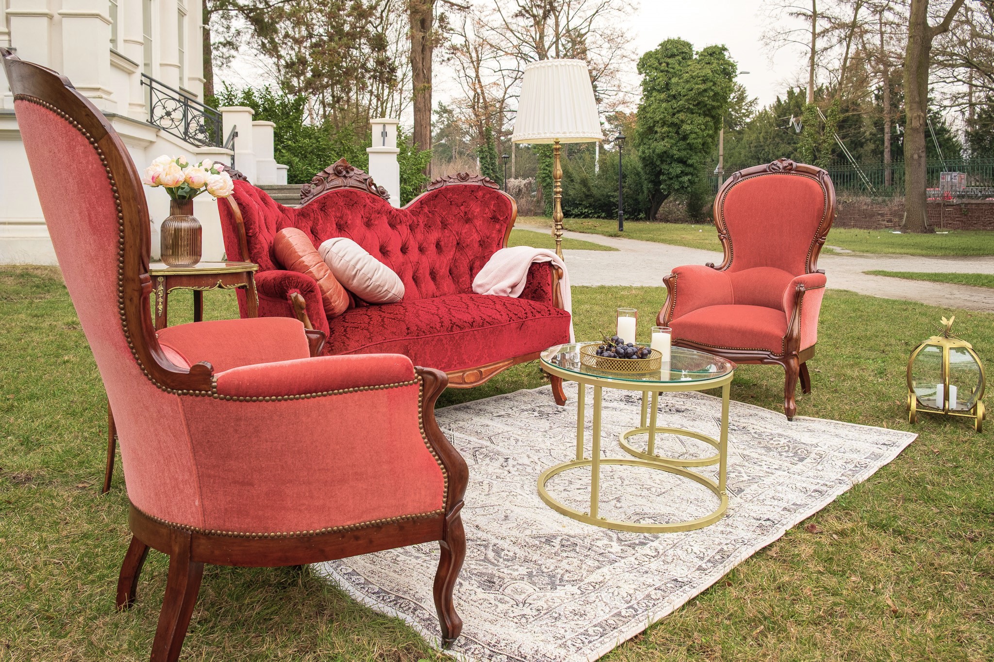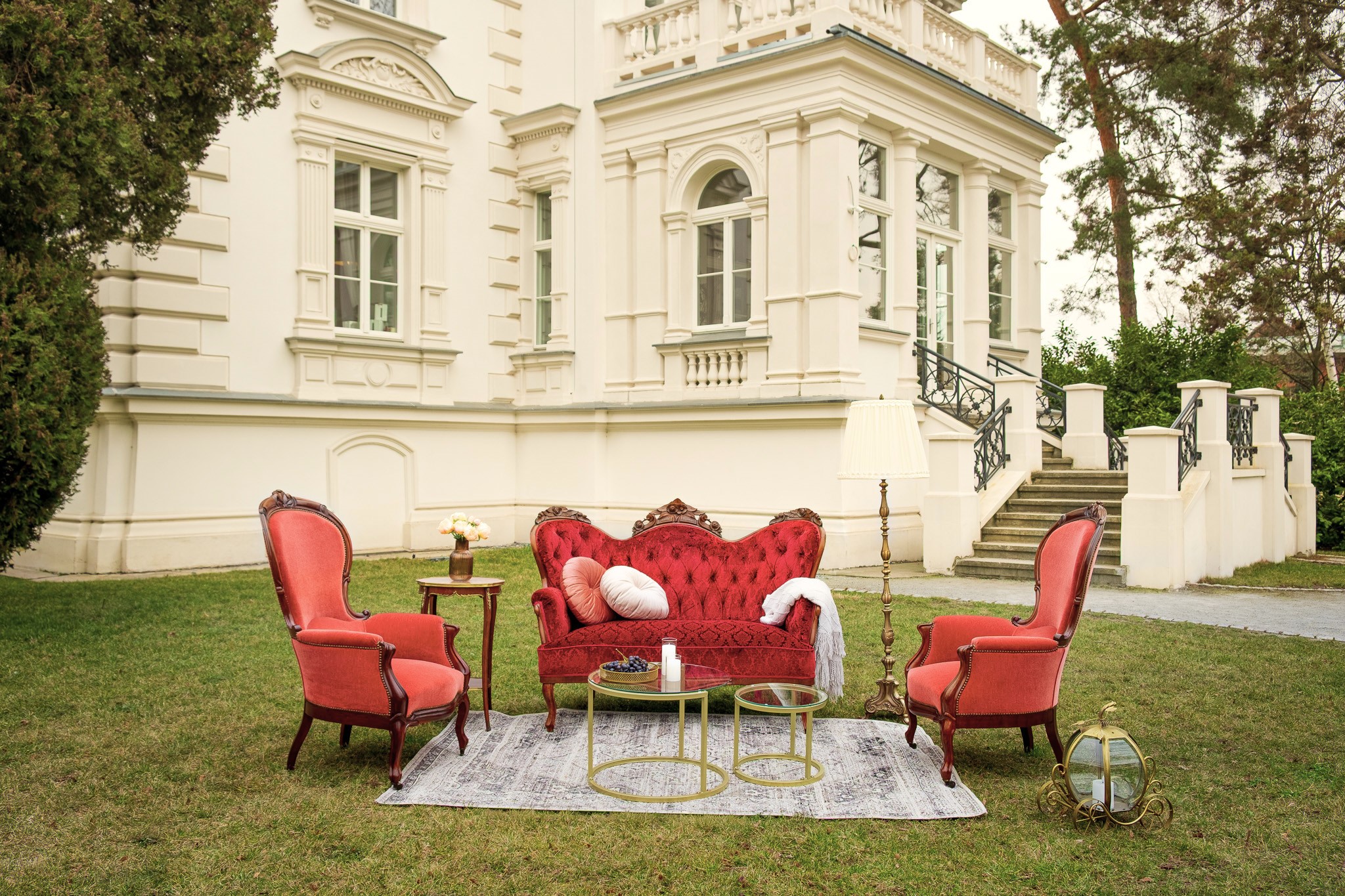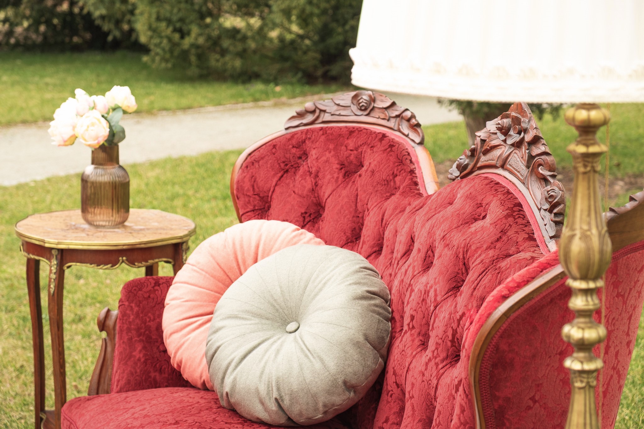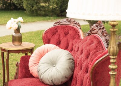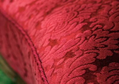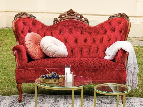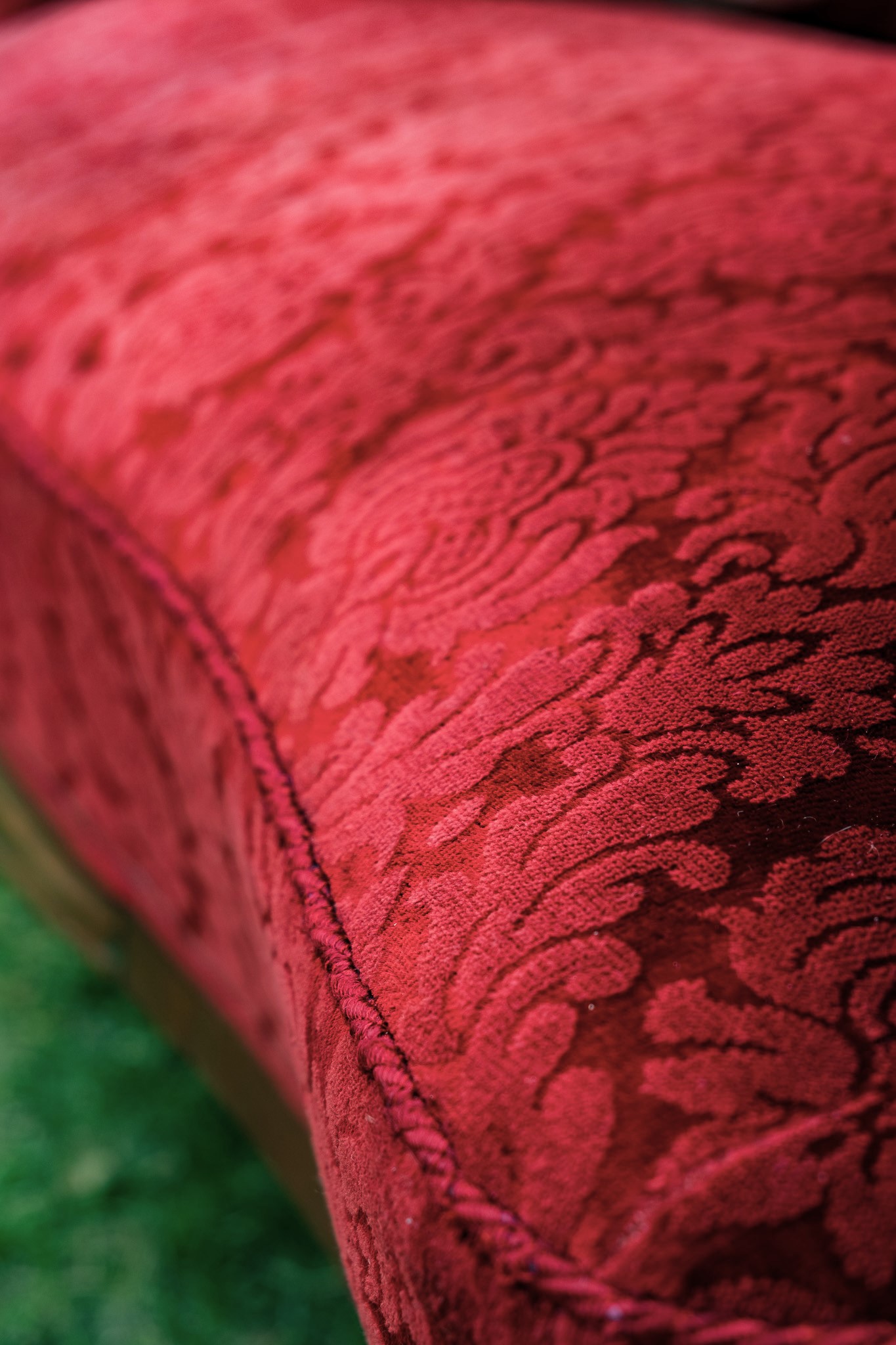 Sofę zdobi szlachetny, zamszowy aksamit w nasyconym, głębokim odcieniu burgundu. Wyjątkowy charakter sofy podkreślają głębokie pikowania, a drewnianą ramę dodatkowo wieńczą misternie rzeźbione róże.