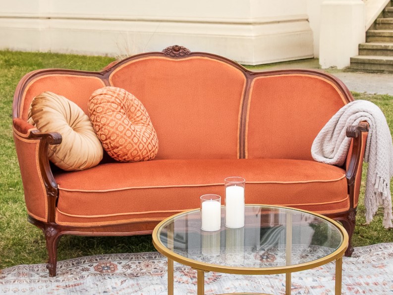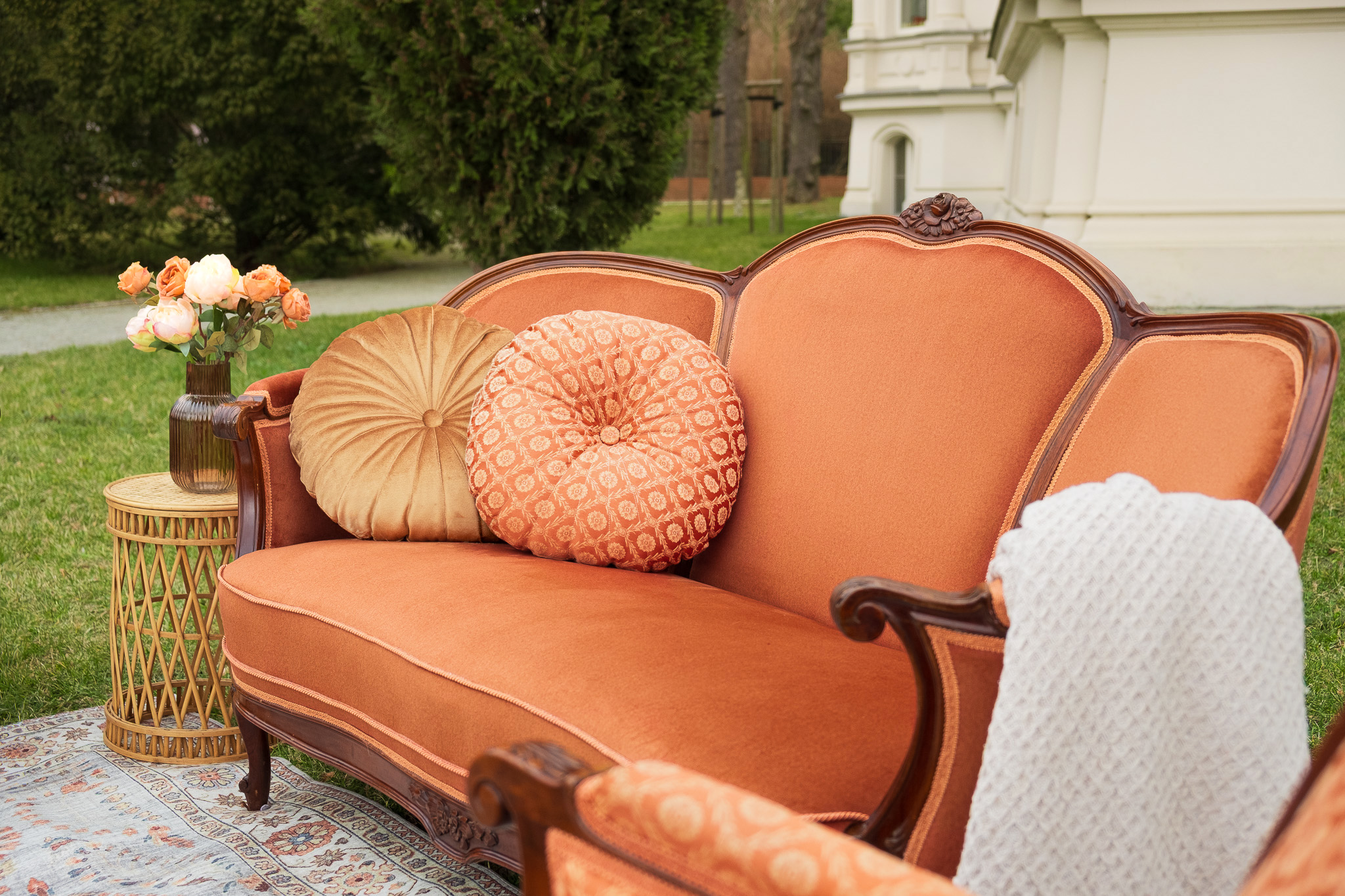 Sofa w charakterystycznym kształcie przypominającym muszlę w ciepłym odcieniu terakoty z motywem róży rzeźbionym na ramie.