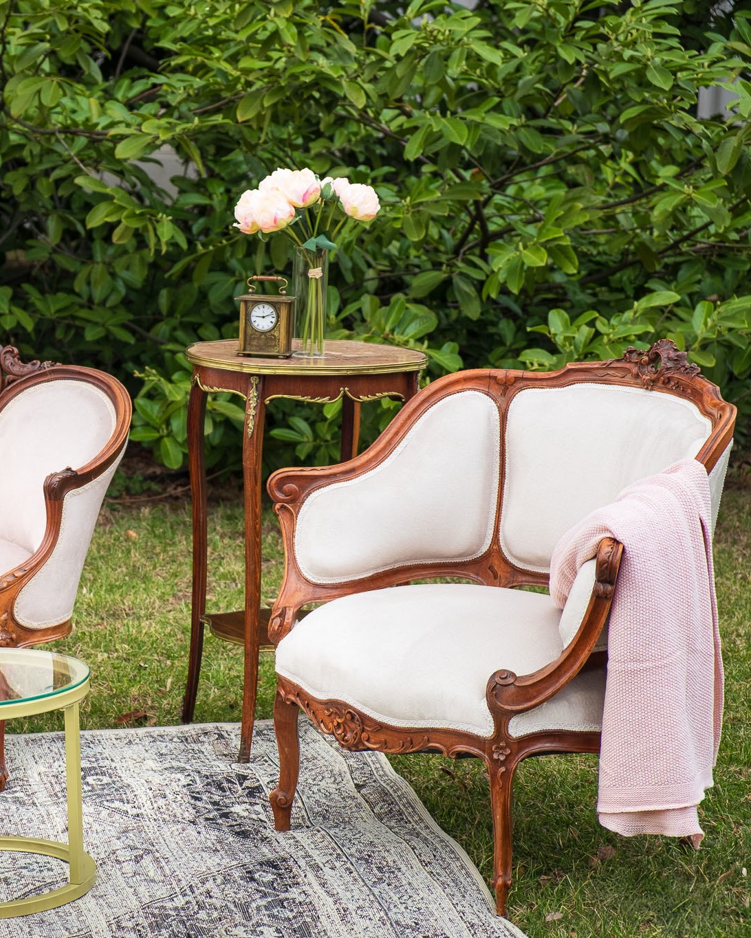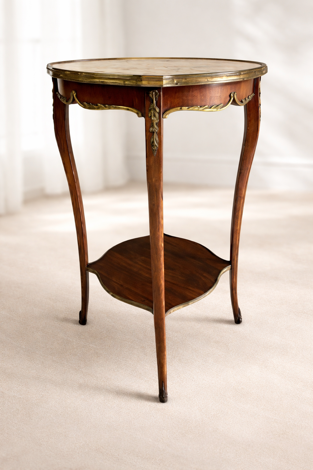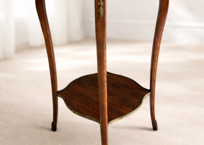 Elegancki stolik typu ludwik na wysokich nóżkach z kamiennym blatem i mosiężnymi okuciami.