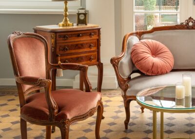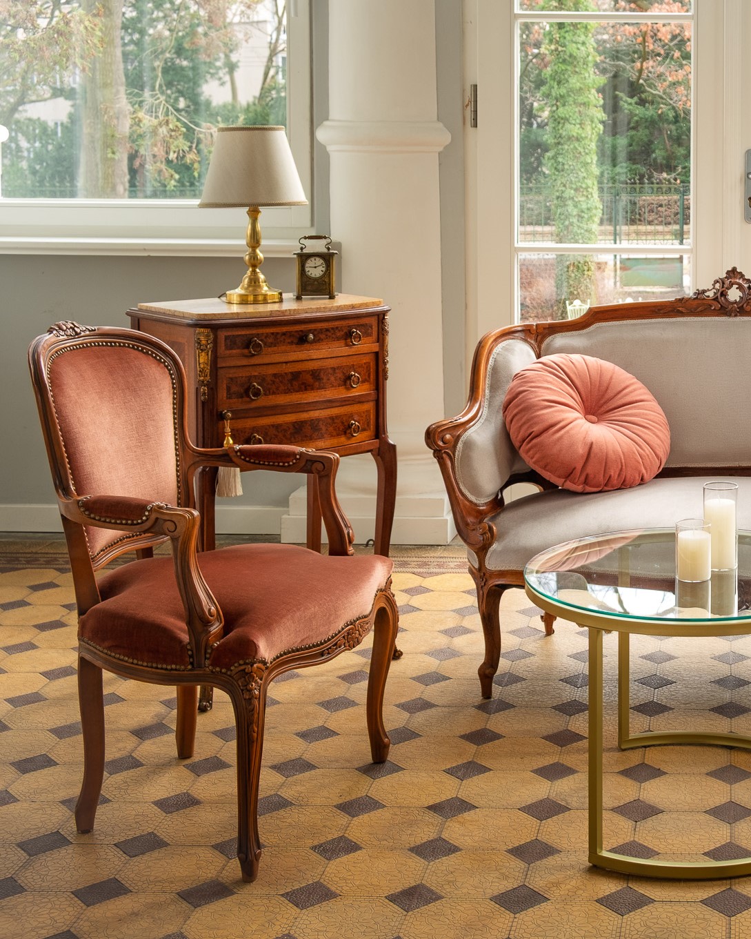 Elegancki stolik typu ludwik na wysokich nóżkach z kamiennym blatem, mosiężnymi okuciami i szufladami.