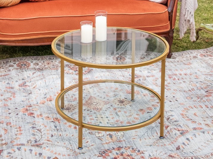 Elegancki szklany, okrągły stolik kawowy w kolorze ciemnego złota.