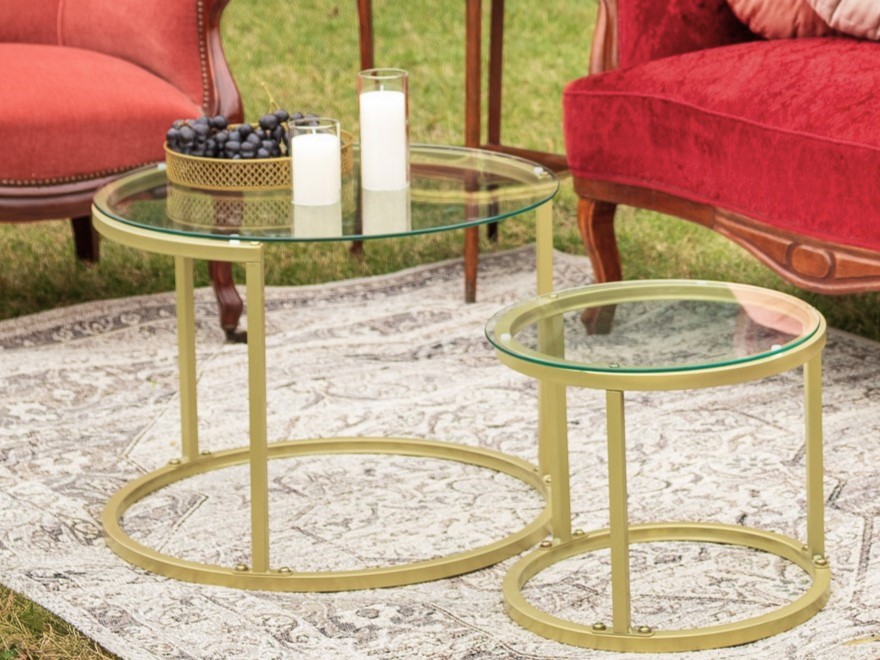 Elegancki zestaw dwóch szklanych, okrągłych stolików kawowych typu nesting w kolorze jasnego złota.