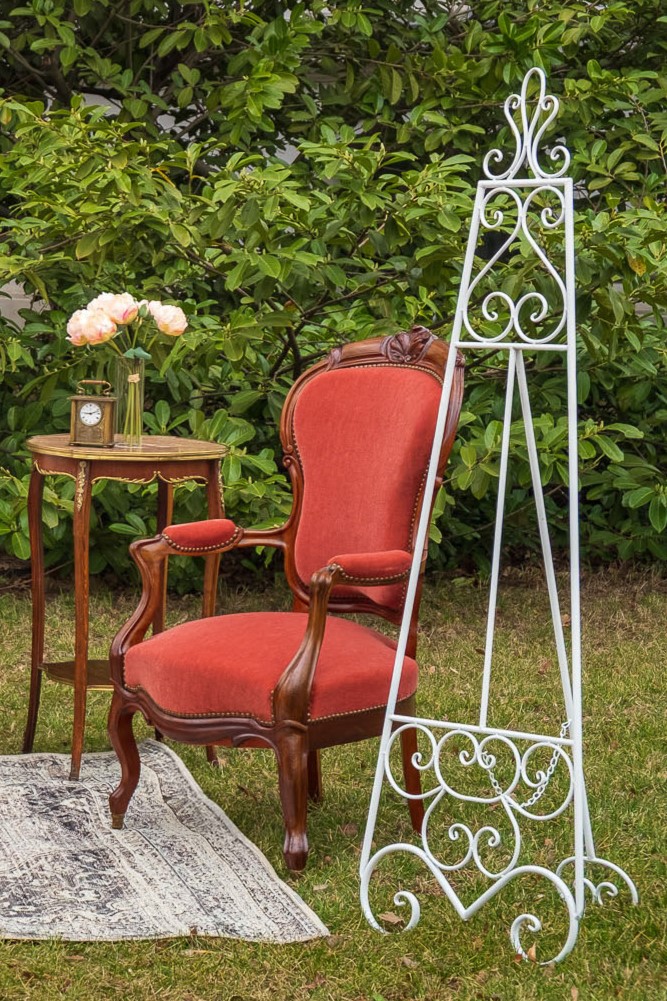 Elegancka, dekoracyjna biała sztaluga o ażurowej konstrukcji, idealnie eksponuje tablice powitalne lub plany stołów podczas uroczystości.