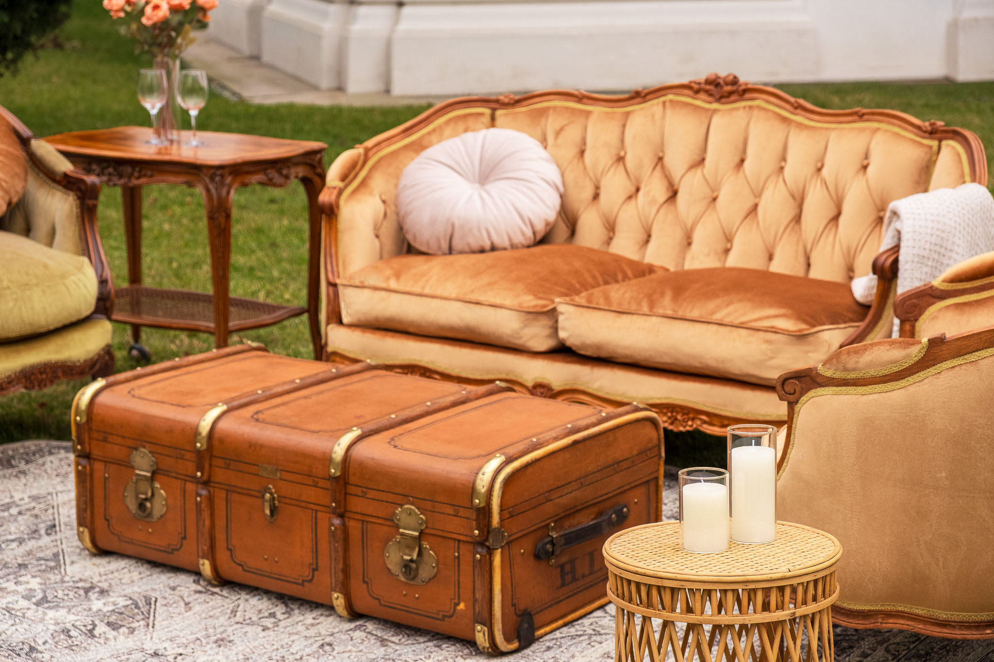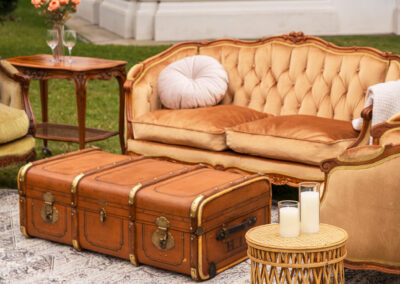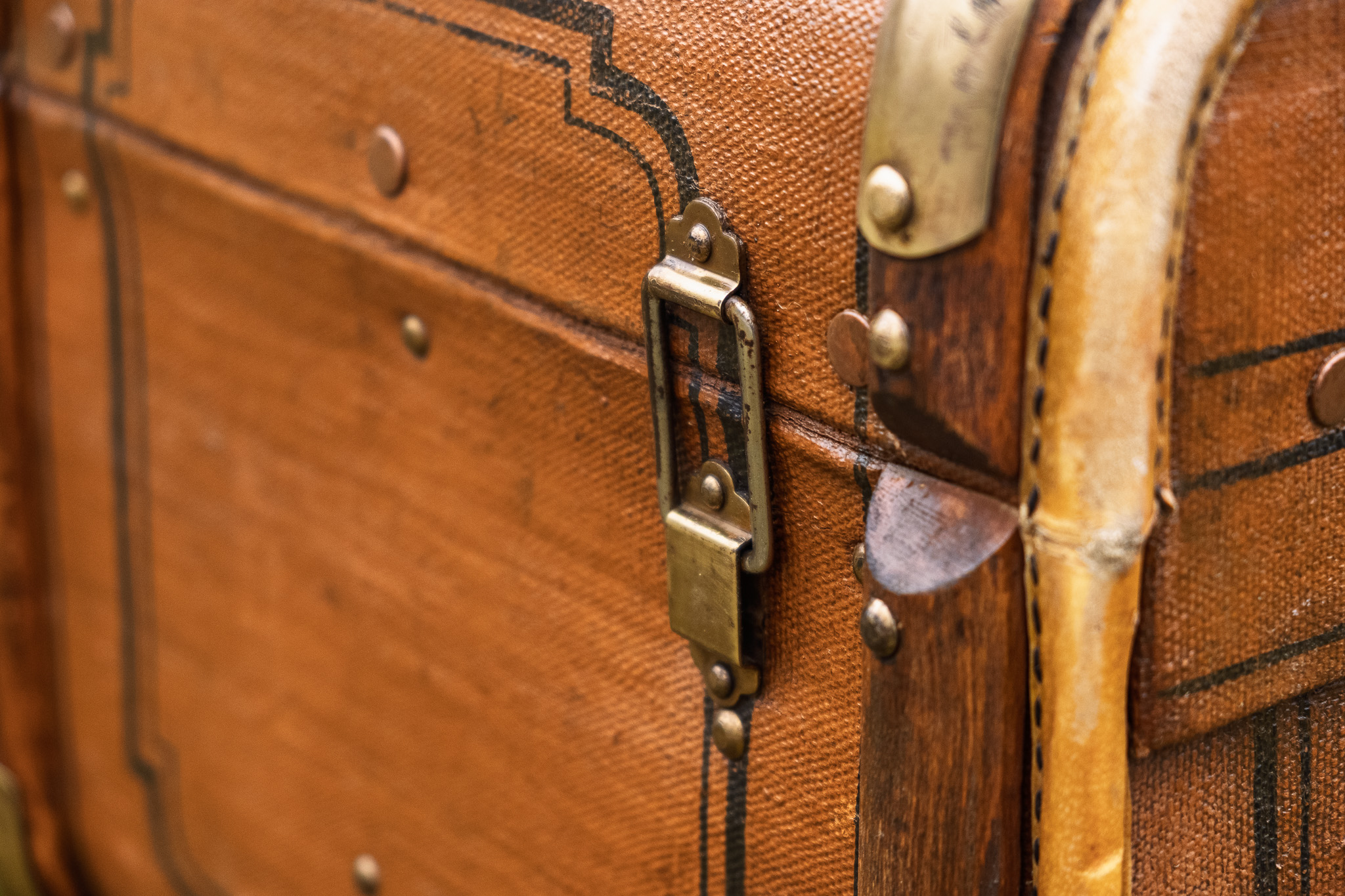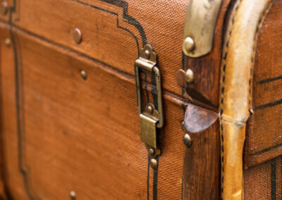 Walizka bagażowa vintage w kolorze ciepłego brązu z mosiężnymi okuciami i historycznymi inicjałami. Doskonale sprawdzi się jako stylowy stolik kawowy, lub element dekoracyjny.