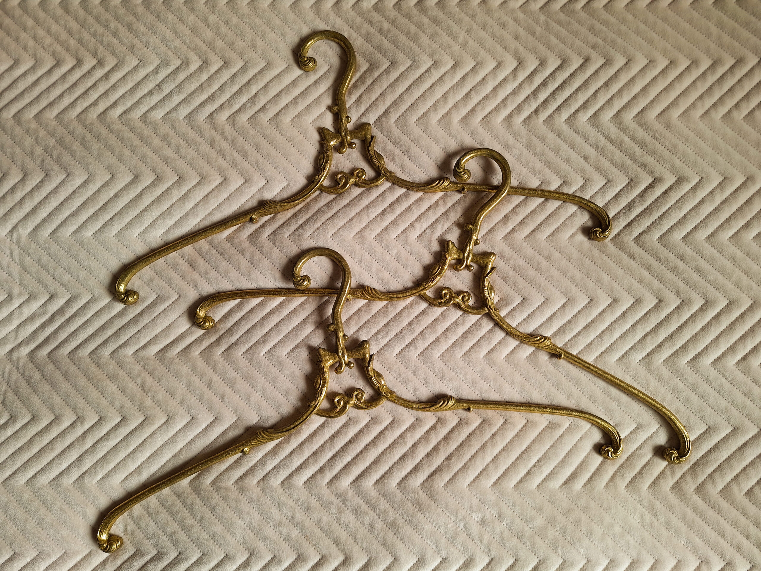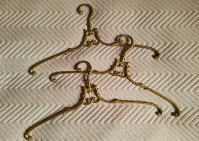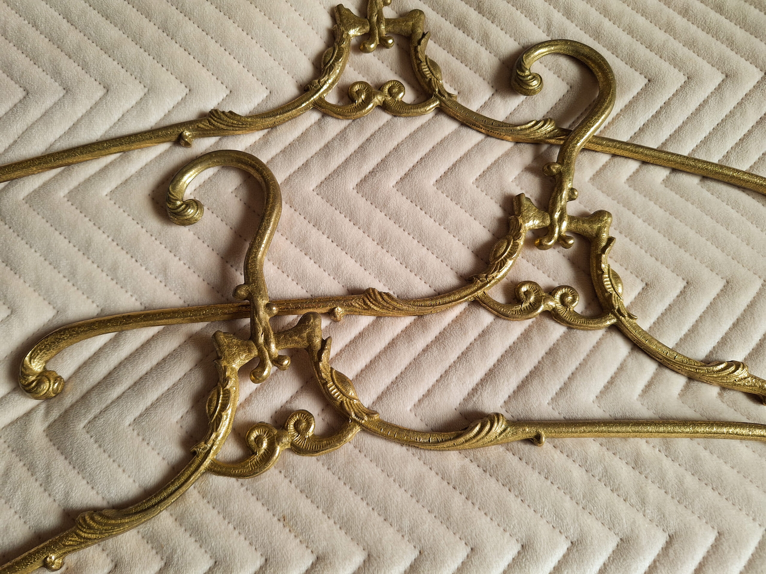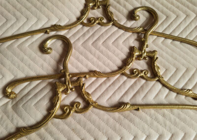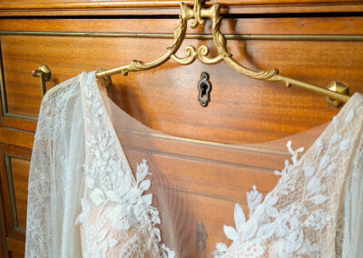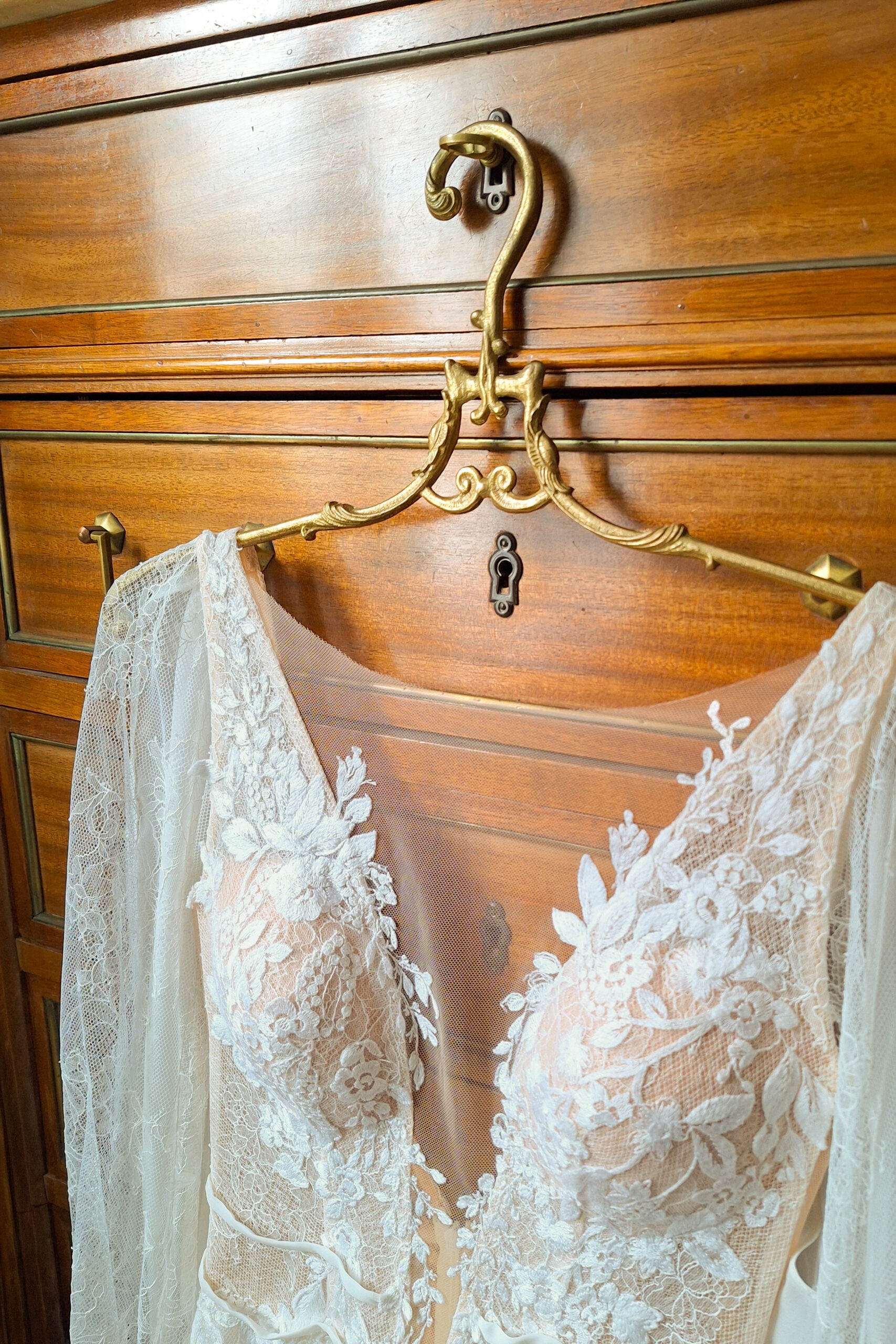Mosiężny, dekoracyjny wieszak vintage stanowi eleganckie dopełnienie ślubnej stylizacji, idealnie eksponując suknię podczas przygotowań i sesji zdjęciowej.